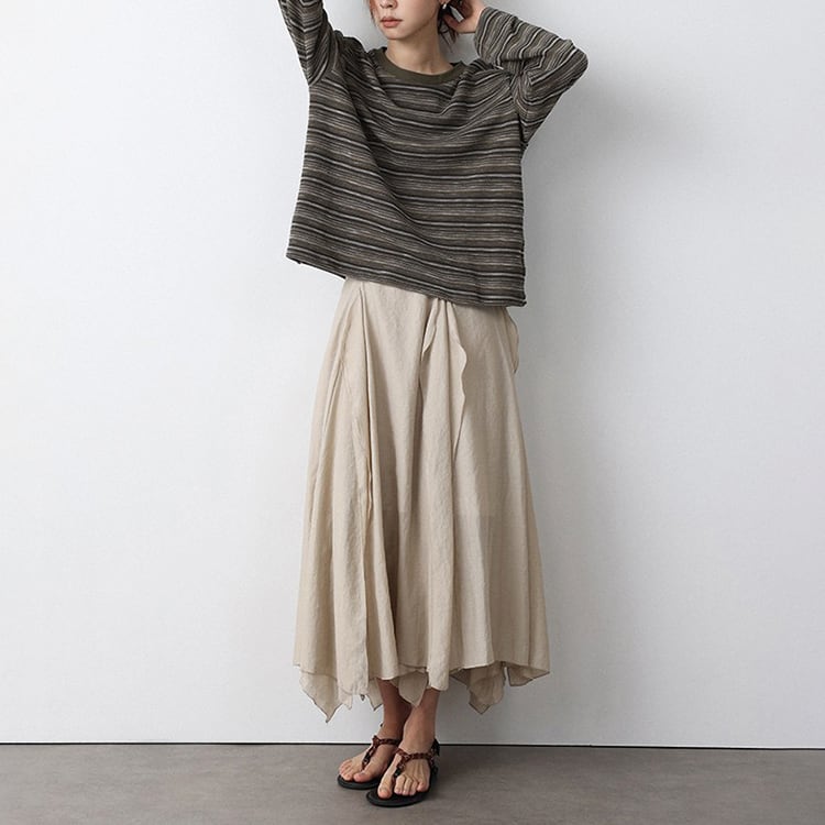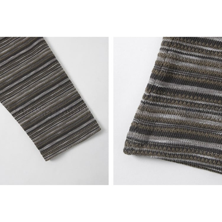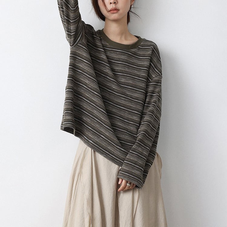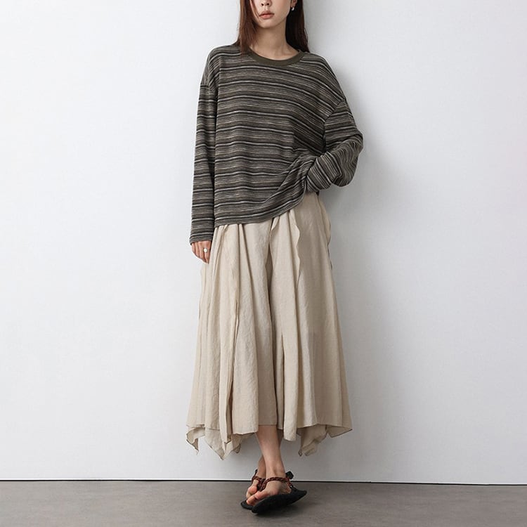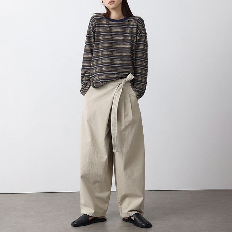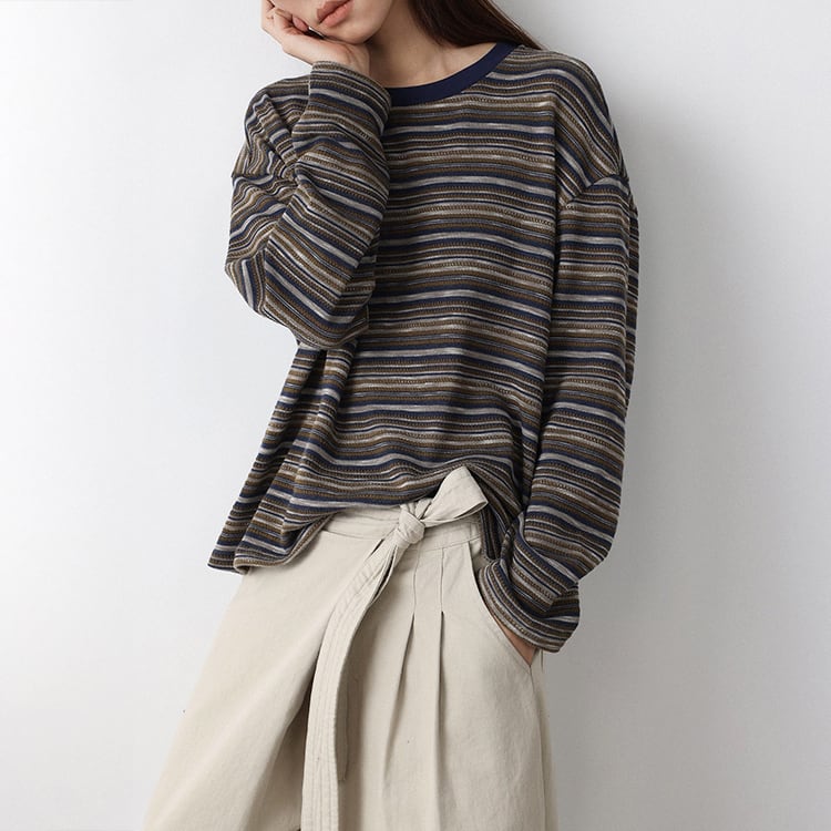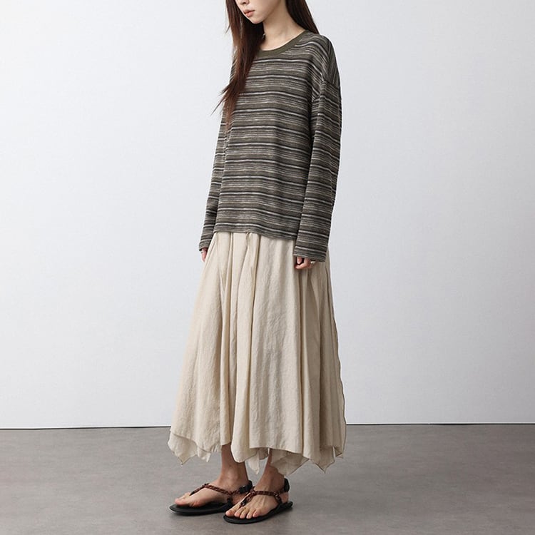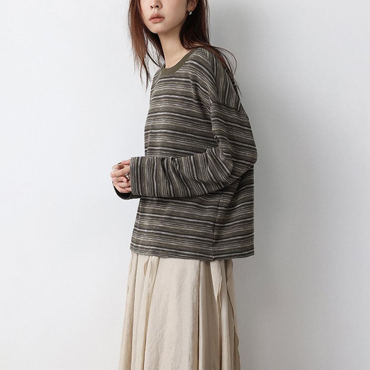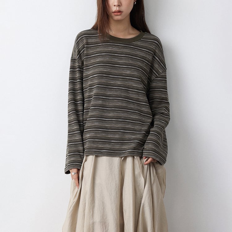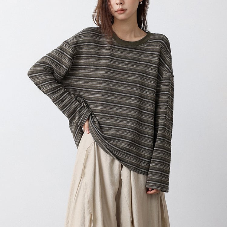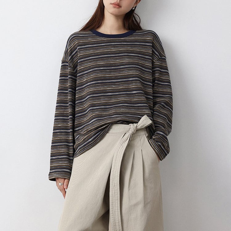 細めのニュアンスボーダーが特徴的なニットトップス。クルーネックデザインが、首元をスッキリと見せ、体のラインを拾わないドロップショルダーのゆったりシルエット。定番のボーダーも、複数の色が混ざり合うマルチボーダーなら洗練された印象に。落ち着いたカラー展開で、春や秋は一枚で、冬場はコートやカーディガンのインナーとして、一年を通して長く愛用いただけます。 【サイズ】 M:肩幅54cm / バスト118cm / 袖丈52cm / 袖口26cm / 裾120cm / 着丈61cm L:肩幅55cm / バスト122cm / 袖丈53cm / 袖口27cm / 裾124cm / 着丈62cm *モデル身長168cm(Lサイズ着用) 【カラー】 グレーグリーン / ネイビーグレー 【素材】 ポリエステル47% コットン28% レーヨン21% ポリウレタン4% 【注意事項】 ・タイミングによっては商品在庫切れにより、注文キャンセルとさせていただく恐れもございますので、予めご了承くださいませ。 ・こちらは輸入品となります。日本製とは検品基準が異なる為、新品未使用品でもごくわずかな汚れやほつれがある場合もございます。 ・仕入れ工場を変えることがあるため、記載サイズと若干異なる場合がございます。 ・商品の色味は、お手持ちのスマートフォン画面によって実物と若干異なる場合がございます。 ・イメージ違いやサイズ交換等、お客さまご都合による交換、返品は対応出来かねます。 ■選べるお支払い方法 ・クレジットカード決済(VISA/Master/JCB/AMEX) ・Amazon pay ・キャリア決済(docomo/au/Softbank/Y!mobile) ・あと払いPayID ■お届けについて こちらの商品は海外店舗より直接発送となる為、 ご入金から10日~3週間前後での発送となります。 ↓ご購入前にこちらをお読みください https://closetly.shopselect.net/about