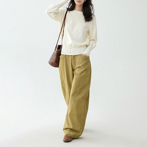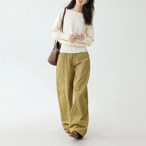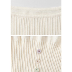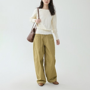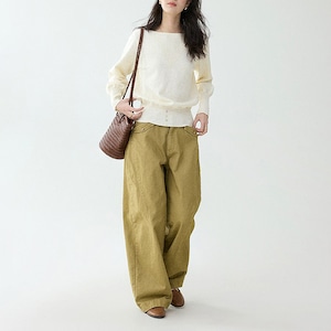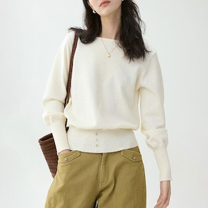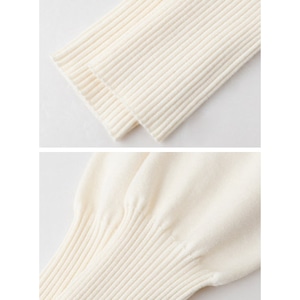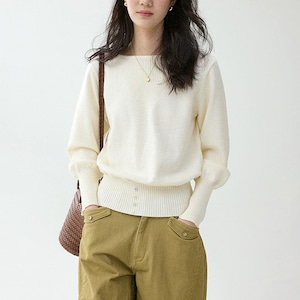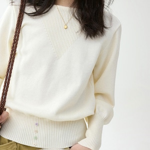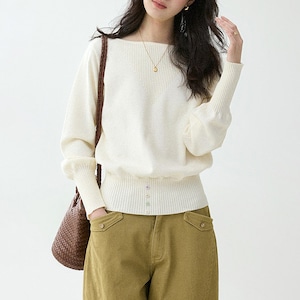 デコルテを美しく見せるボートネックと、キュッと絞られた裾リブのコントラストが絶妙なニットトップス。袖口に向かってふんわり広がるパフスリーブと、手首のリブが長めなので、腕をまくった時のボリュームがこなれ感を演出。裾部分のパステルボタンもアクセントに。オフィスコーデからデイリー使いまで、幅広いシーンで活躍する春のデザインニットです。