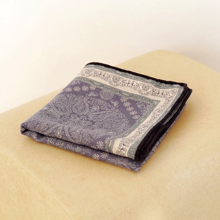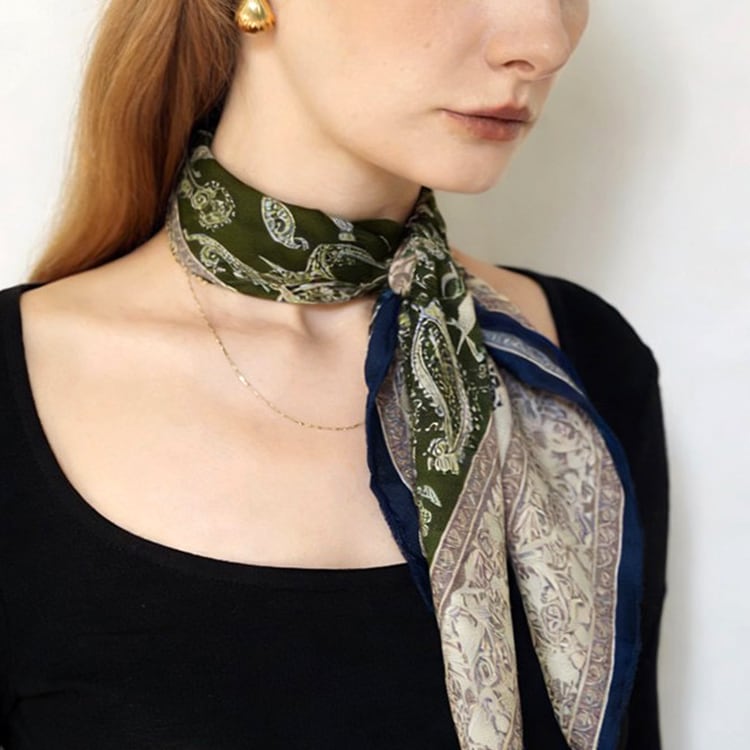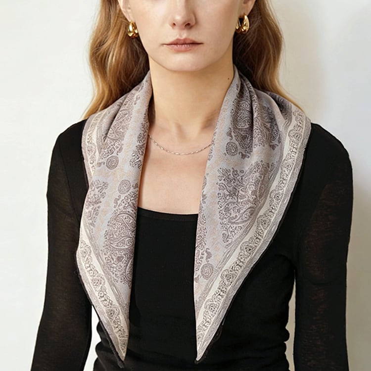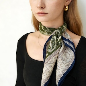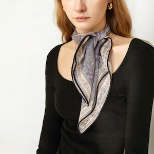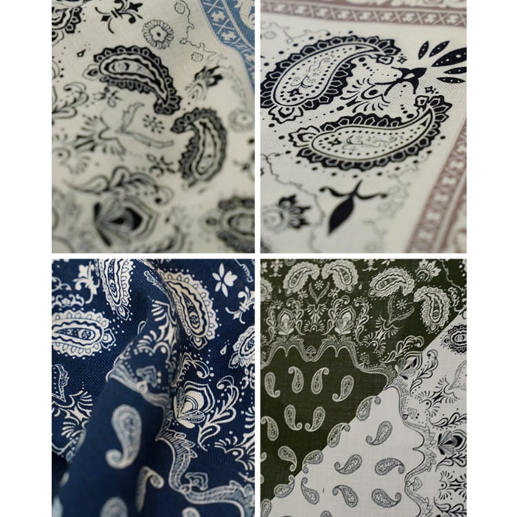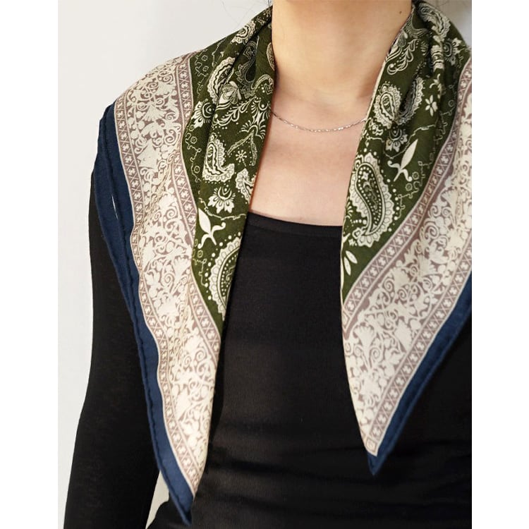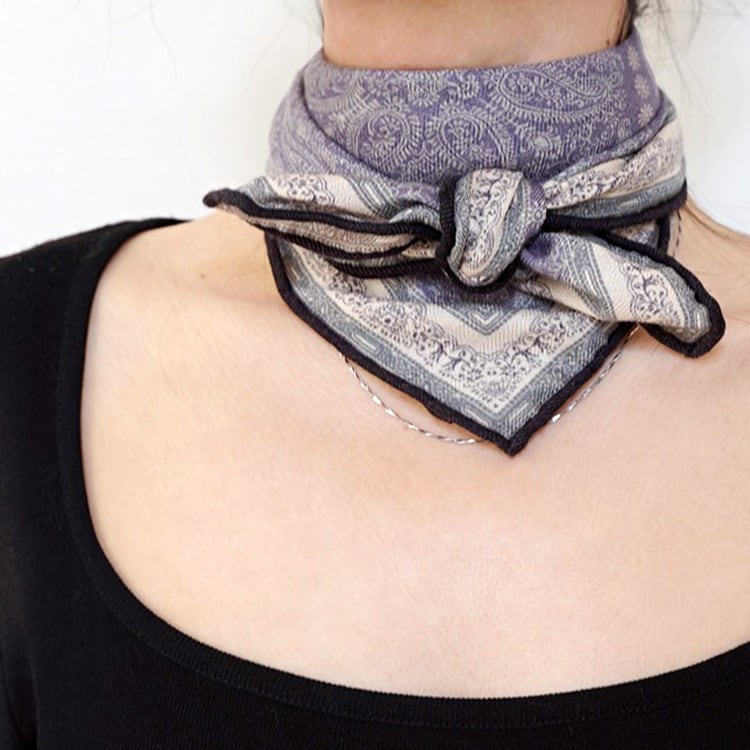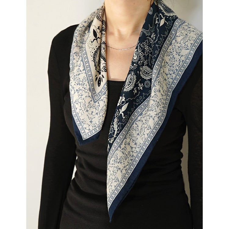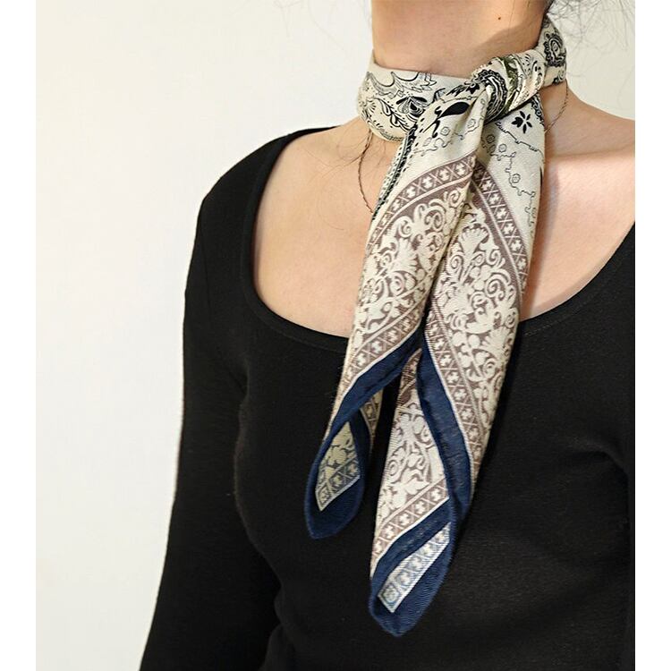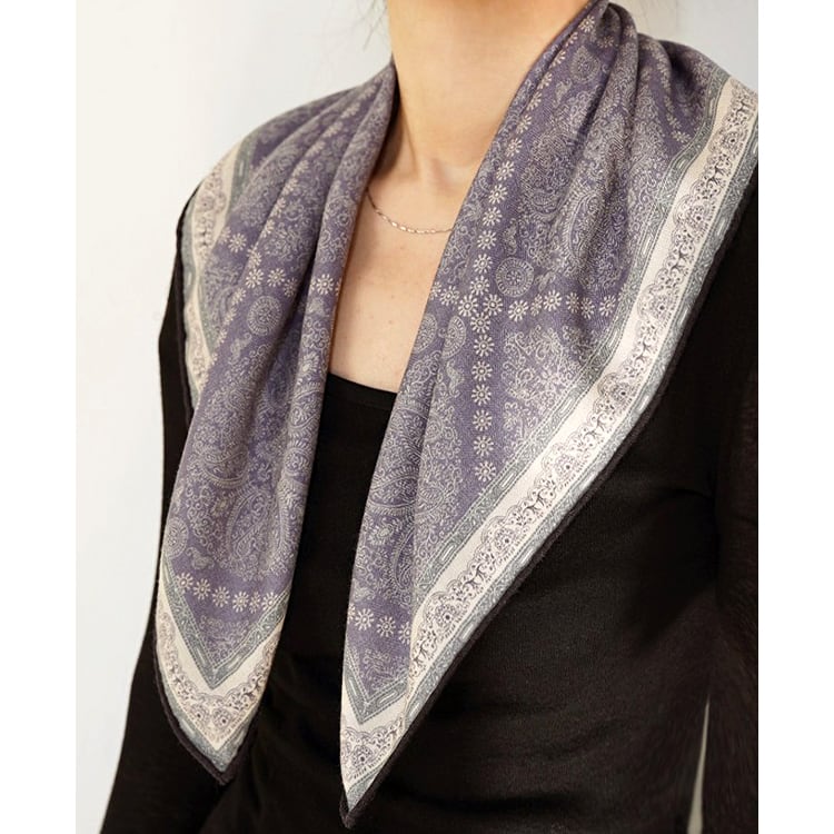 フレンチシックな、上品なペイズリー柄スクエアスカーフ。程よい厚みと柔らかさを兼ね備え、両面プリント仕様で、結び方や角度によって異なる表情を楽しめます。防寒、冷房対策としても使える、季節やシーンを問わず活躍し、ブルー系・パープル系ともに落ち着いた色味で、大人コーデに馴染みやすい一枚です。