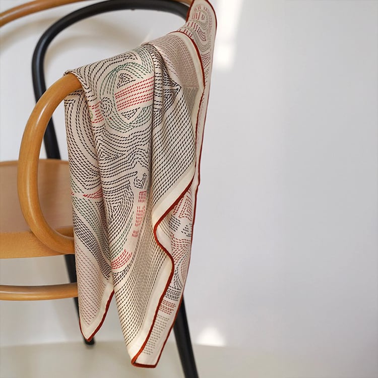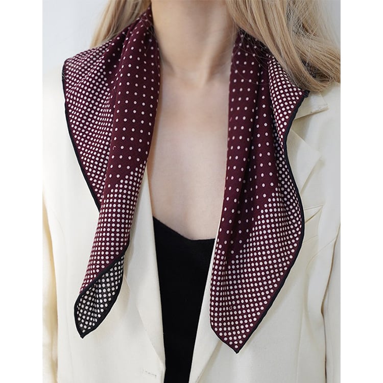 上質感あふれる素材に、幾何学ドット柄が特徴のスクエアスカーフ。モダンでありながらどこかアート的な両面デザイン。ベージュは優しく上品に、レッド×ブラックは洗練されたアクセントとして、シンプルな装いに一点加えるだけで、コーディネートがぐっと格上げされます。