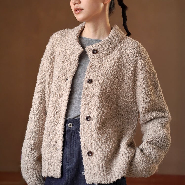 柔らかなブークレ糸を使用した、ふんわりとした表情が魅力のカーディガン。ボタンを留めればコンパクトなトップス風に、開ければリラックス感のある羽織りに。付属のウエストベルトで女性らしいラインを演出でき、パンツにもスカートにも好相性。落ち着いた色味で甘くなりすぎず、大人の装いにぴったりのアイテムです。
