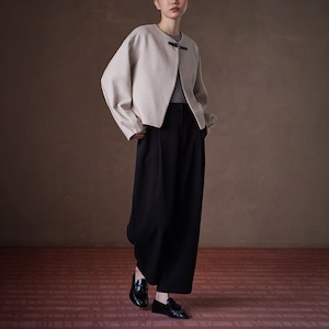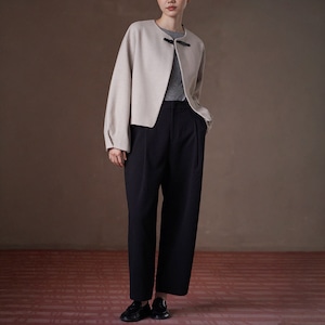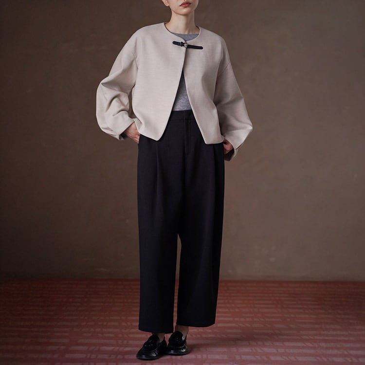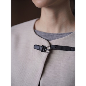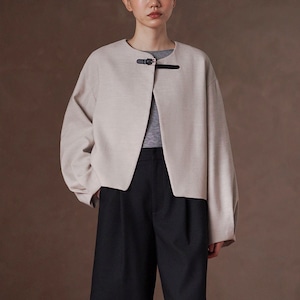 ミニマルデザインの洗練されたノーカラーショートジャケット。レザーバックルのディテールが、シンプルなデザインに程よいモード感をプラス。ドロップショルダーと体のラインを拾わないゆったりシルエットで、重ね着もスムーズ。シンプルながらも存在感のある、ワードローブに一枚あると重宝するアイテムです。