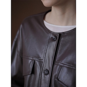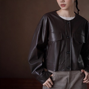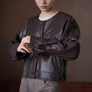 リアルレザーのようなしなやかさと、ヴィンテージライクな印象のフェイクレザージャケット。肩のラインを拾わないドロップショルダーとクロップド丈で、脚長効果も期待でき、小柄さんにもおすすめです。上品なカラーリングのダークブラウンは大人の女性にこそ似合う、主役級のライトアウターです。