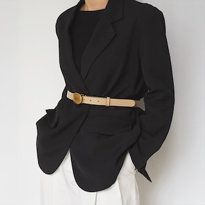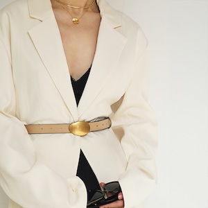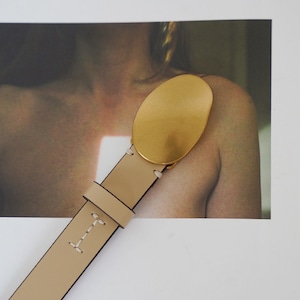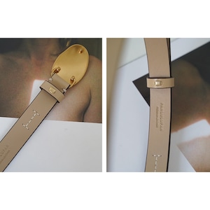 ナチュラルな色の上質なレザーを使用した、大人のための本革ベルト。アンティーク調のオーバルゴールドバックルが、シンプルな装いに程よい存在感をプラス。2.7cm幅はワンピースやパンツスタイルにも使いやすい万能サイズ。通勤スタイル・オフィスコーデにも合わせやすく、毎日のコーデに取り入れるだけで、ワンランク上の大人スタイルが完成します。