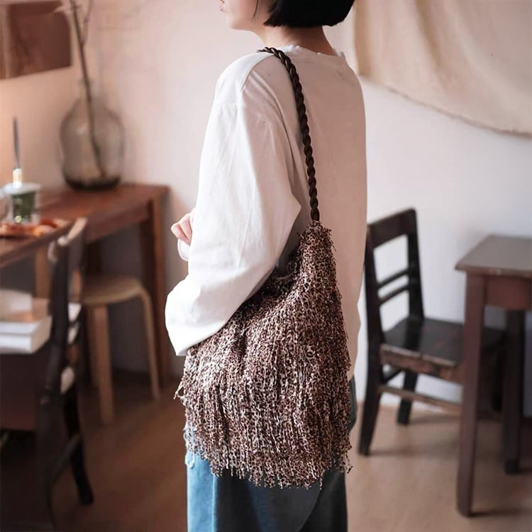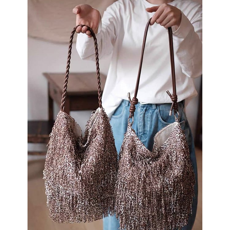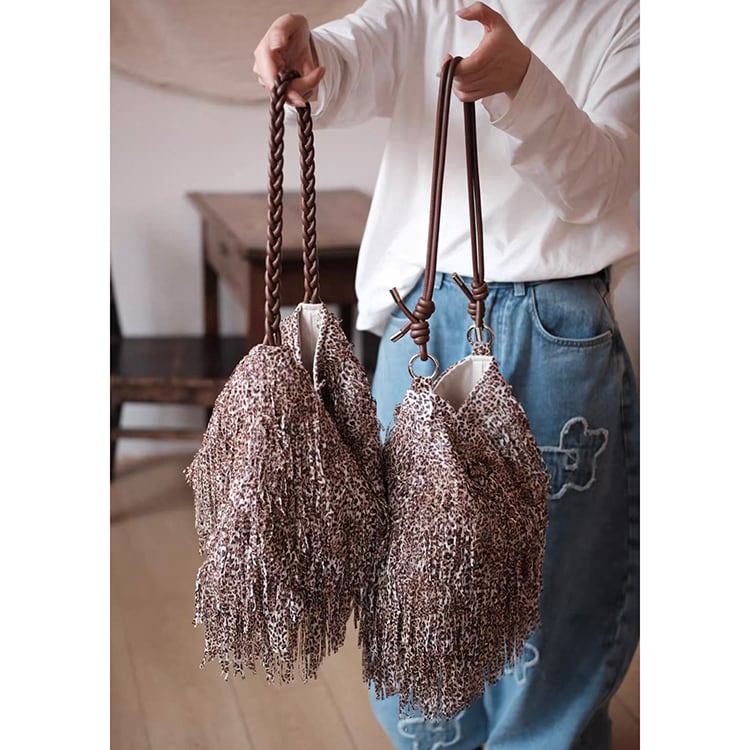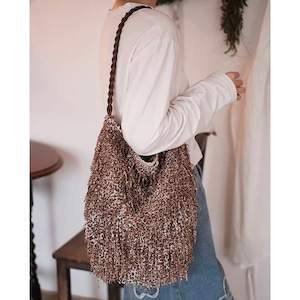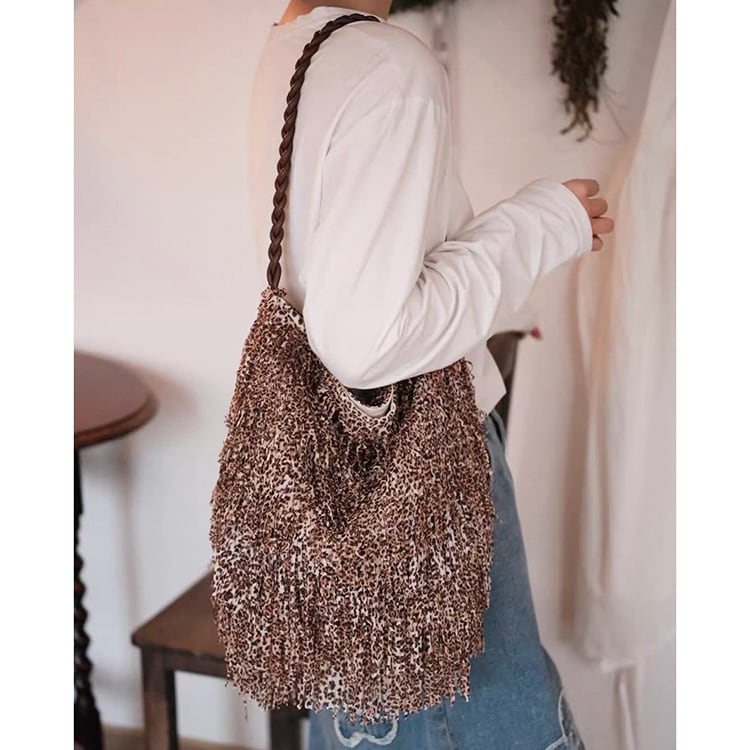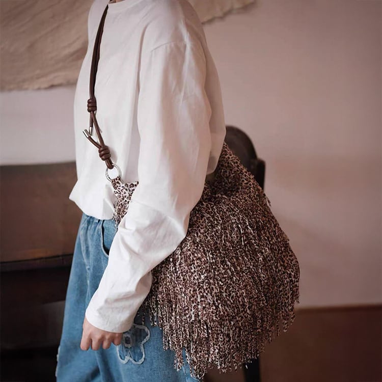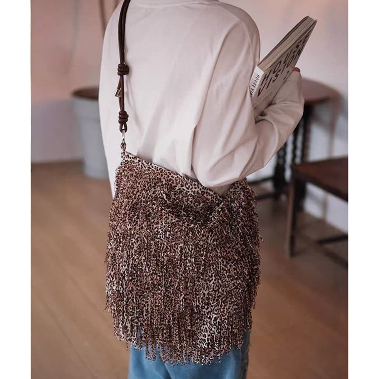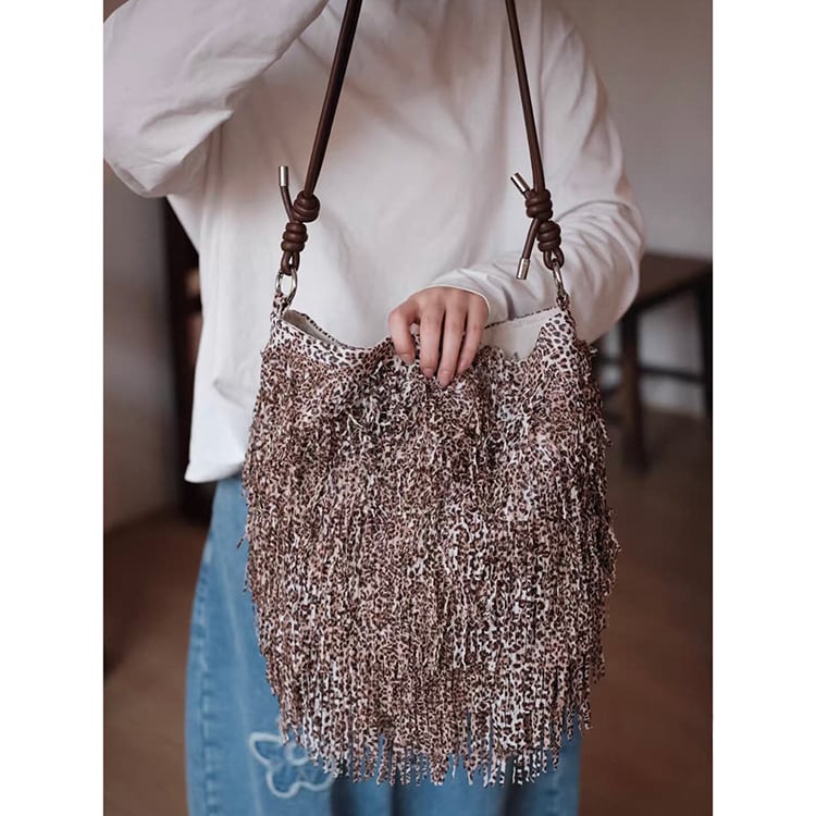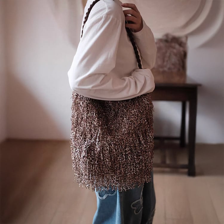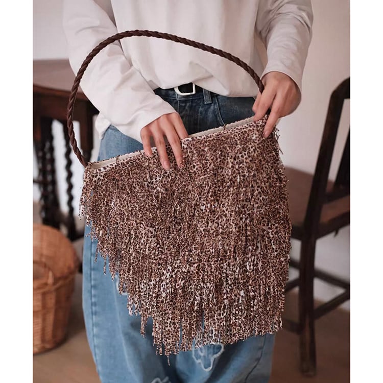 ボヘミアンテイスト漂うフリンジデザインとレオパード柄が目を惹くショルダーバッグ。曲線的、丸みあるフォルムで収納力があり、マグネットボタン開閉で使いやすさも抜群。レオパード柄と全面フリンジ加工が大人の抜け感を演出するショルダーバッグです。