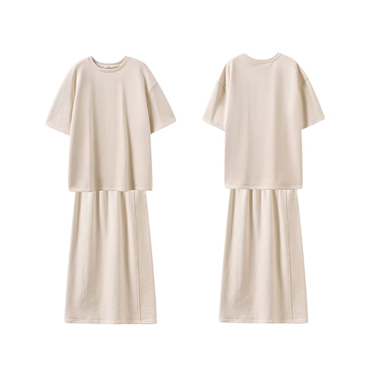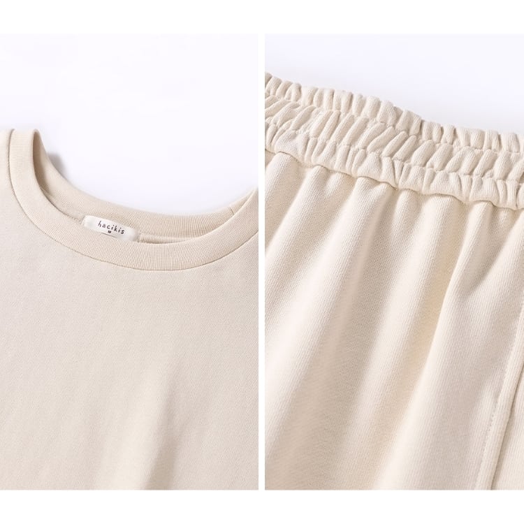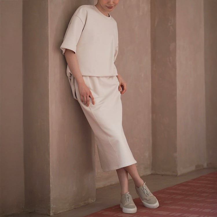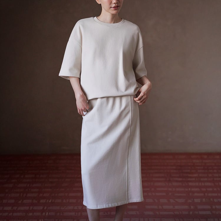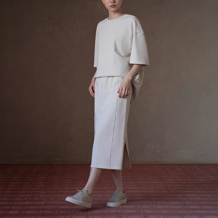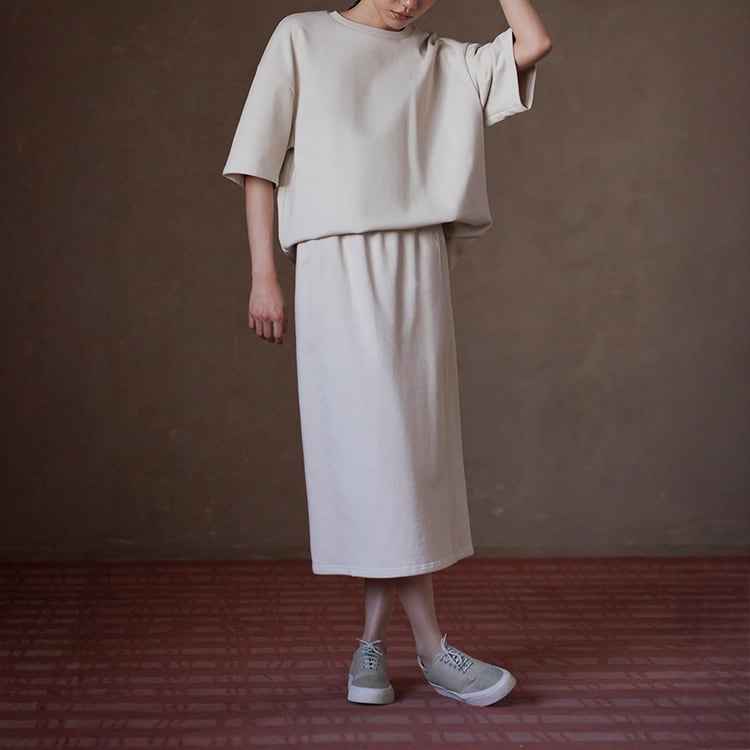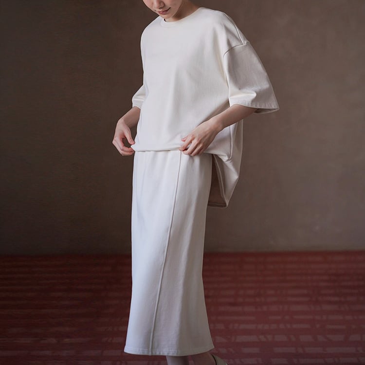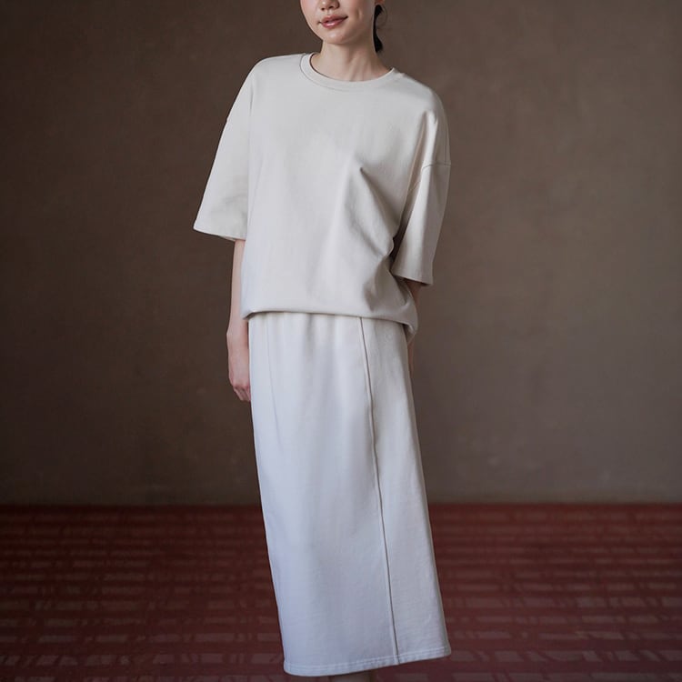 100%コットン素材を使用した、やさしい肌触りのスウェットセットアップ。ゆったりとしたドロップショルダーのトップスと、すっきり縦ラインを強調するロングスカートの組み合わせで、落ち感のあるIラインシルエットが体型を自然にカバー。セットでの着用はもちろん、単品使いでも着回し力抜群のセットアップです。