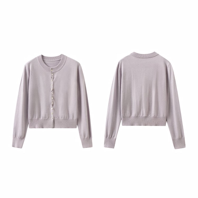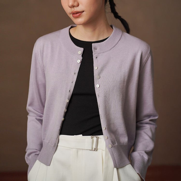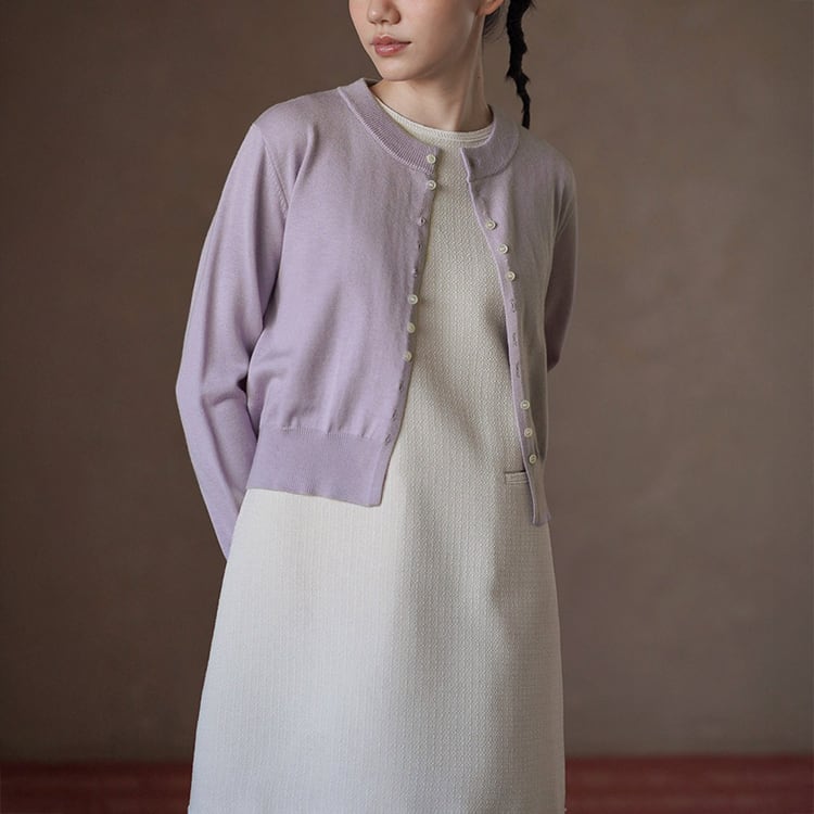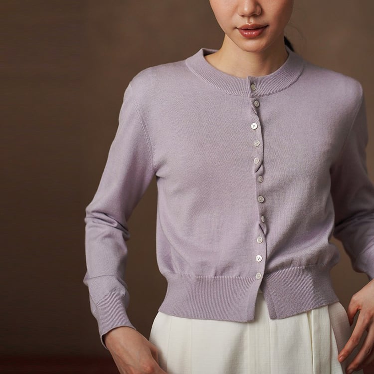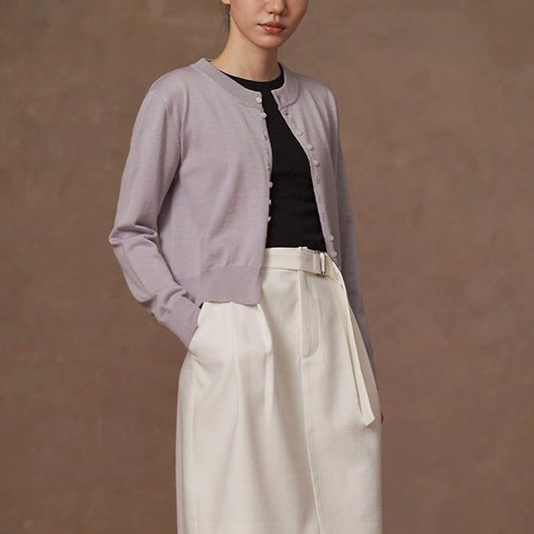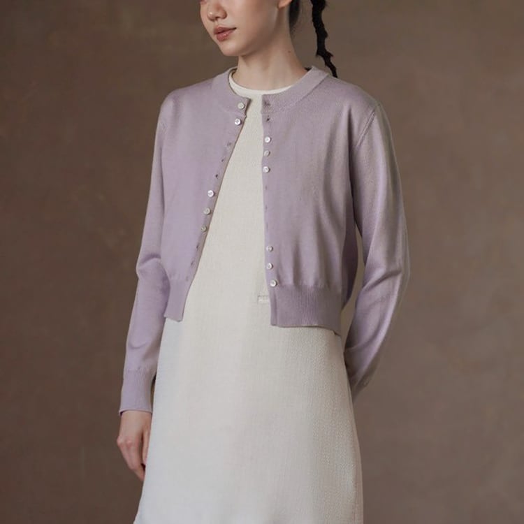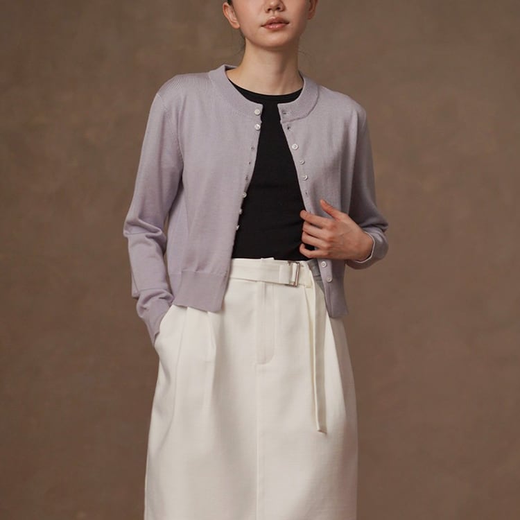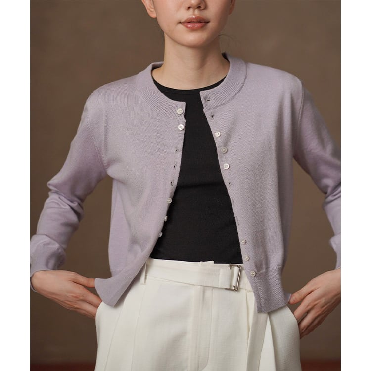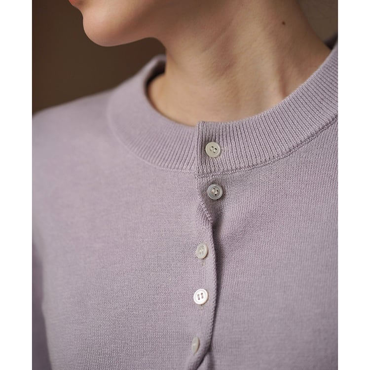 やわらかな光沢と上品な質感が魅力のシルク混ニットカーディガン。交互に配置されたボタンデザインが、留めた際にニュアンスドレープがアクセントになり、自然な立体感を演出。絶妙なショート丈でウエスト位置を高く見せ、スタイルアップを実現。シンプルながらも洗練された大人のための上品カーディガンです。