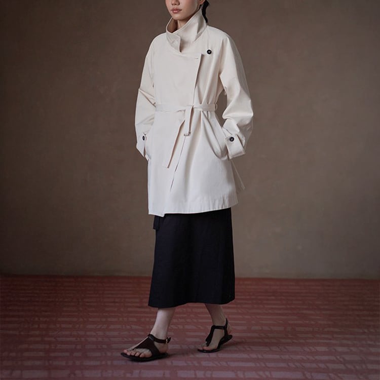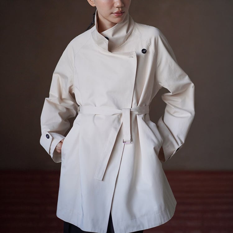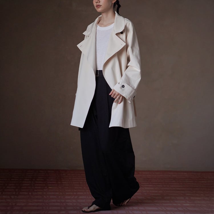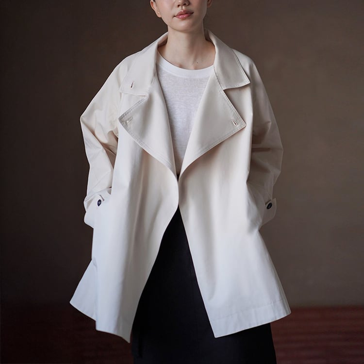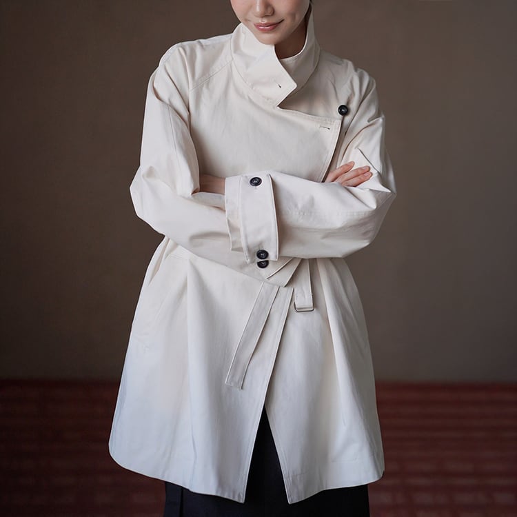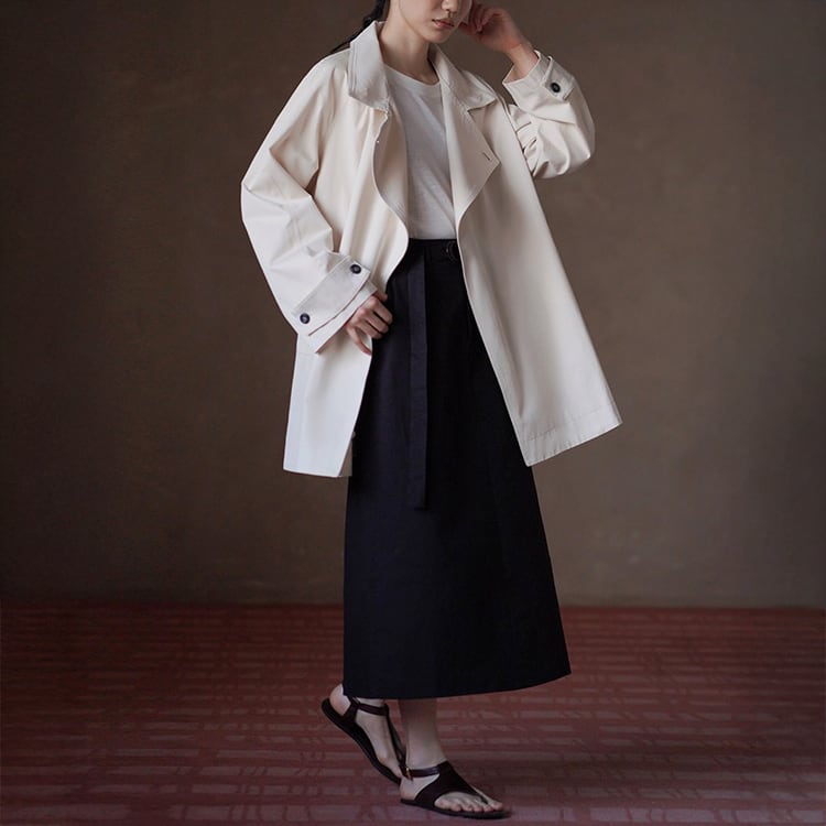 無駄を削ぎ落としたミニマルデザインのミドル丈トレンチコート。立ち襟デザインとアシンメトリーな前立てが、シンプルながらも洗練された雰囲気を演出。小柄さんにも嬉しい絶妙なミドル丈で、重たく見えずスタイルアップ効果も。通勤からお出かけまで幅広く活躍する、春・秋のライトアウターとして長く愛用いただけます。