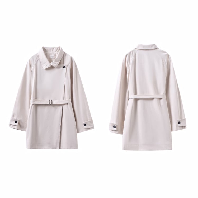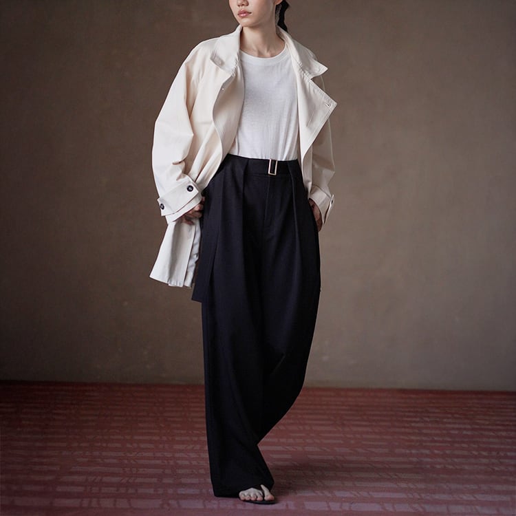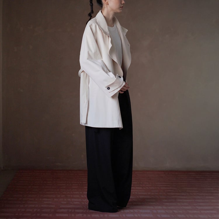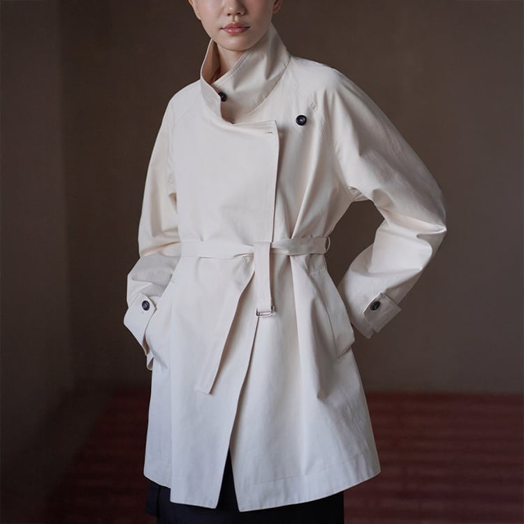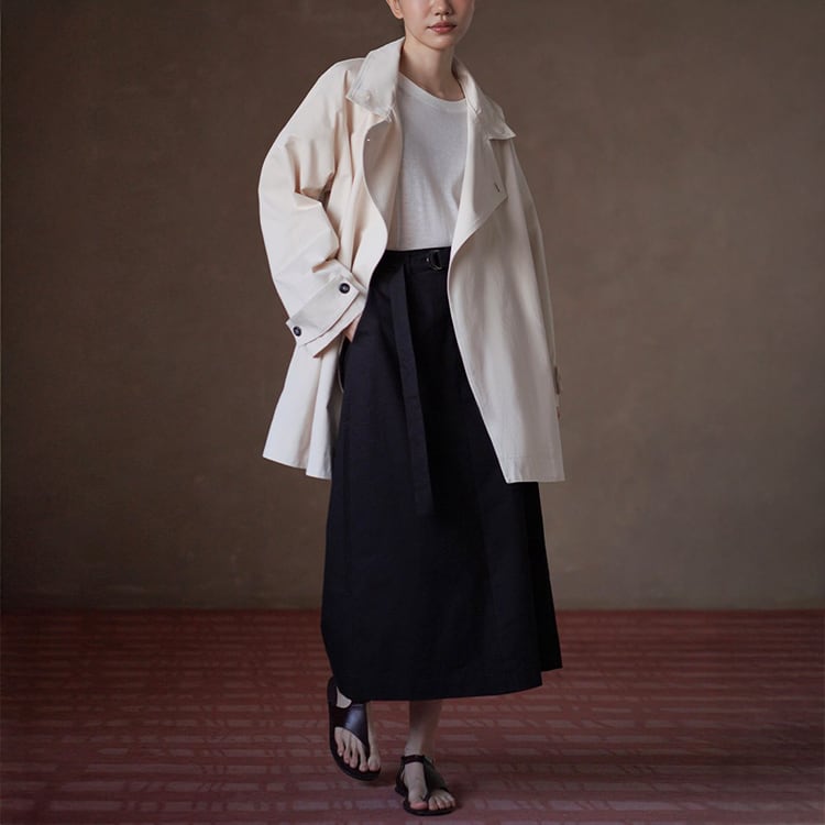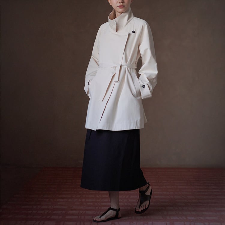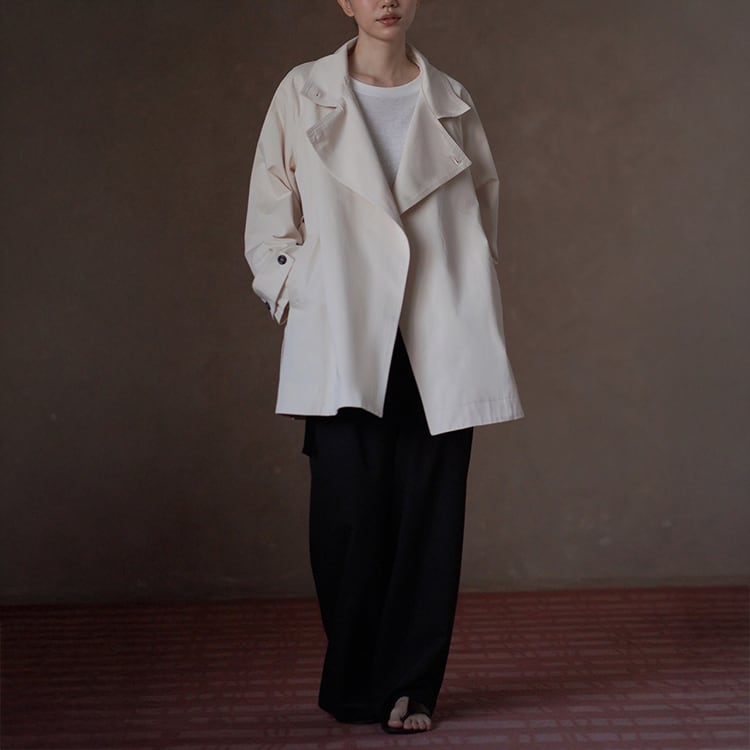 無駄を削ぎ落としたミニマルデザインのミドル丈トレンチコート。立ち襟デザインとアシンメトリーな前立てが、シンプルながらも洗練された雰囲気を演出。小柄さんにも嬉しい絶妙なミドル丈で、重たく見えずスタイルアップ効果も。通勤からお出かけまで幅広く活躍する、春・秋のライトアウターとして長く愛用いただけます。