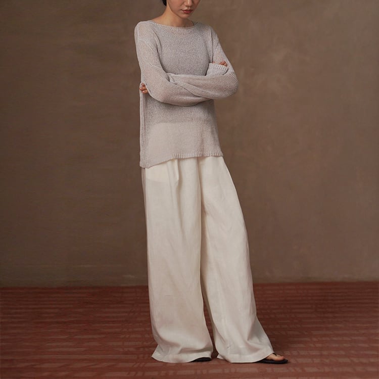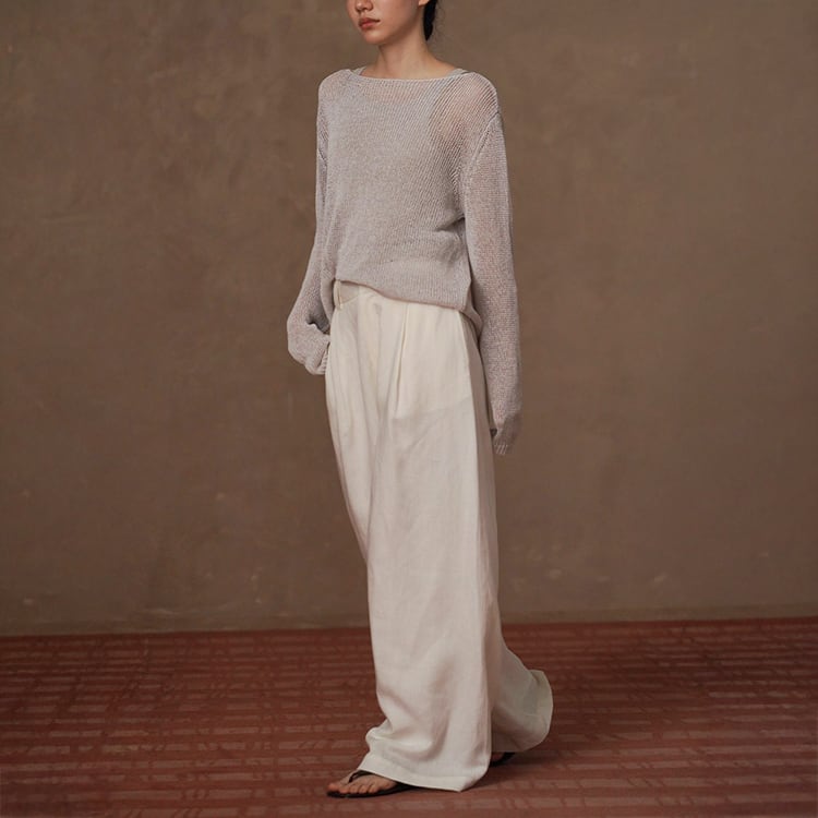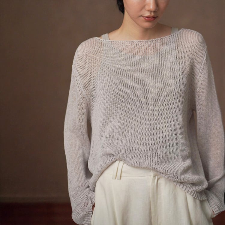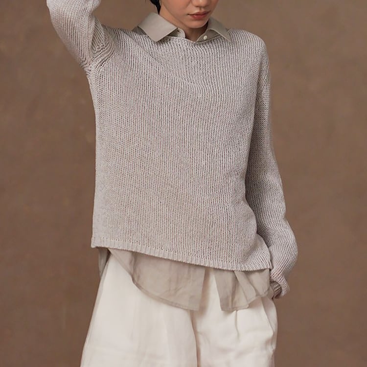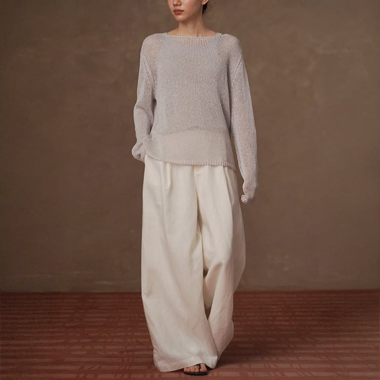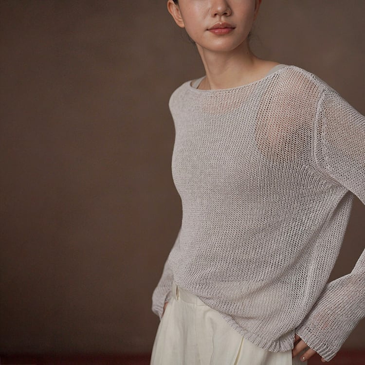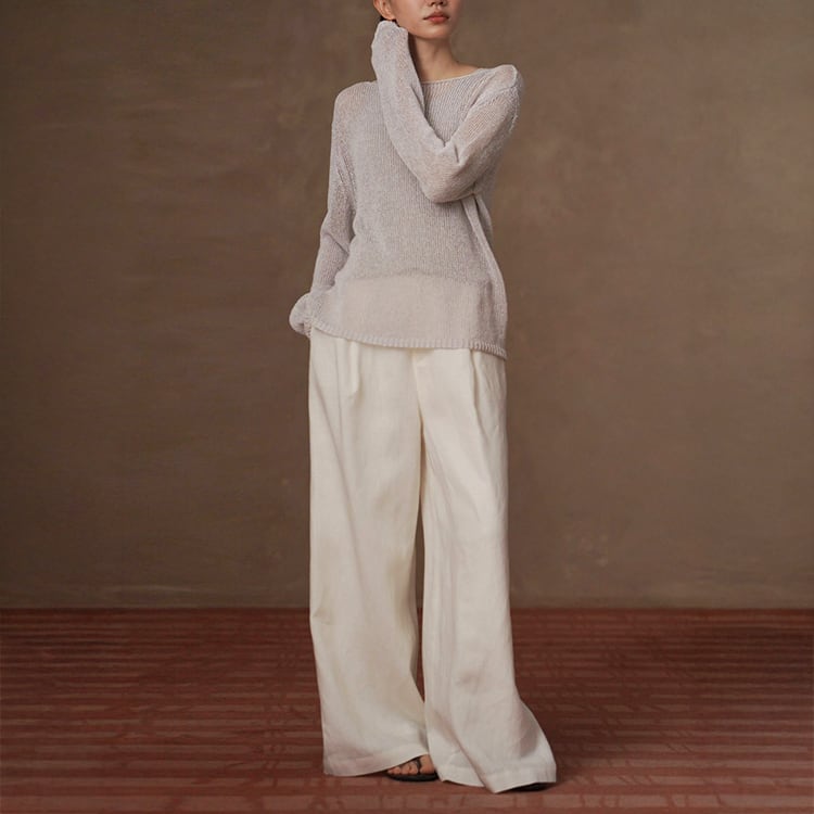 軽くてさらりとしたドライタッチが魅力の和紙風(和紙から作られた和紙糸を使用)サマーニット。ボートネックデザインが首元をすっきりと見せ、ゆったりシルエットが自然に体型をカバー。春夏のリラックス感のある大人カジュアルスタイルにぴったりの一枚です。