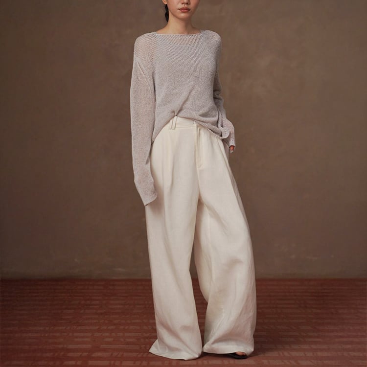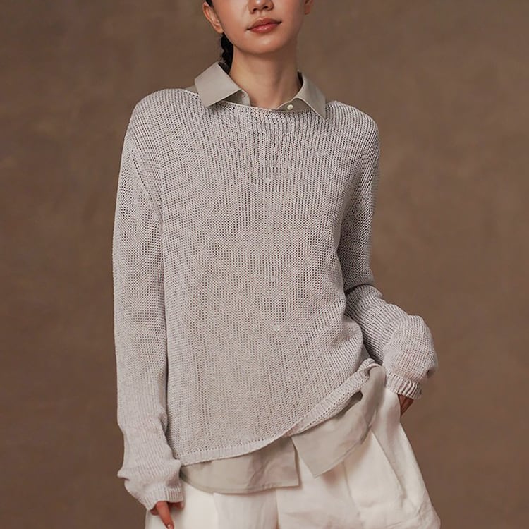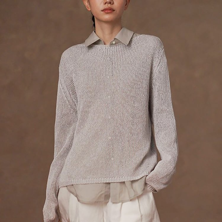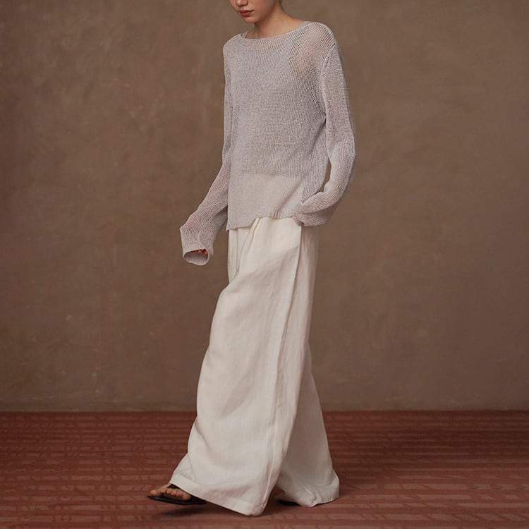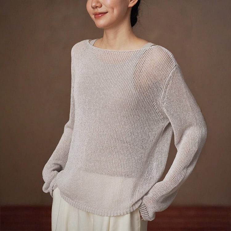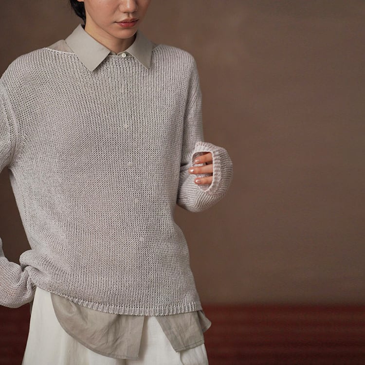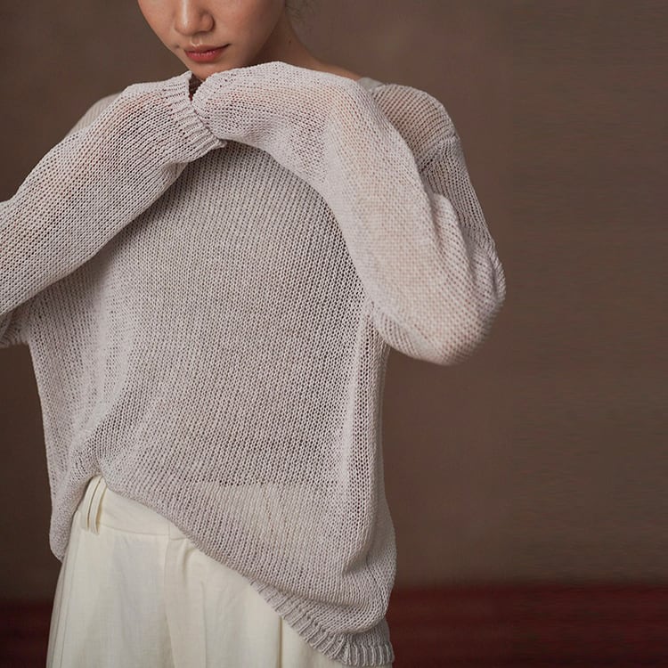 軽くてさらりとしたドライタッチが魅力の和紙風(和紙から作られた和紙糸を使用)サマーニット。ボートネックデザインが首元をすっきりと見せ、ゆったりシルエットが自然に体型をカバー。春夏のリラックス感のある大人カジュアルスタイルにぴったりの一枚です。