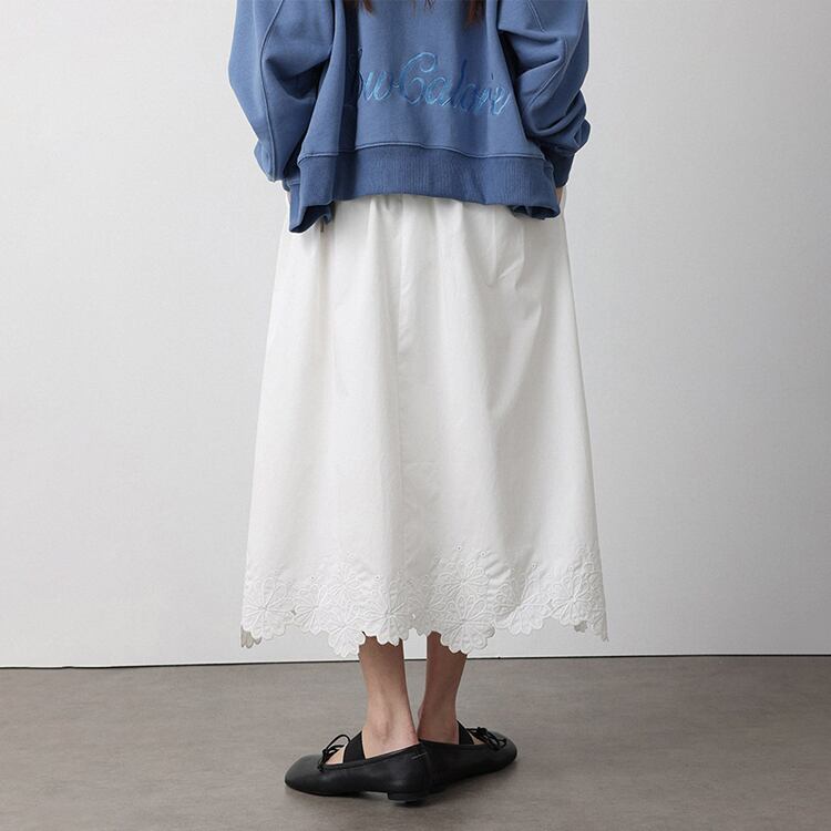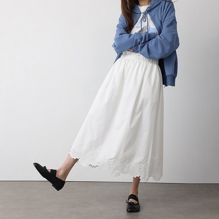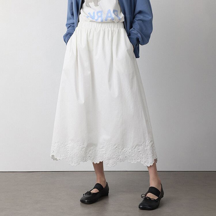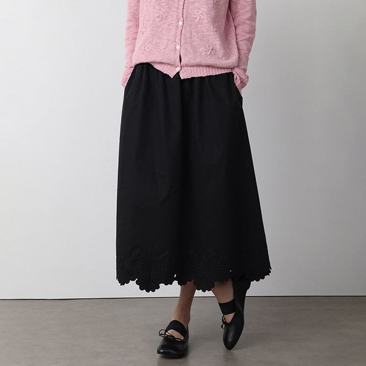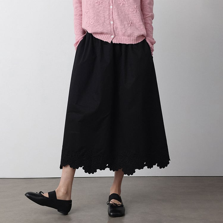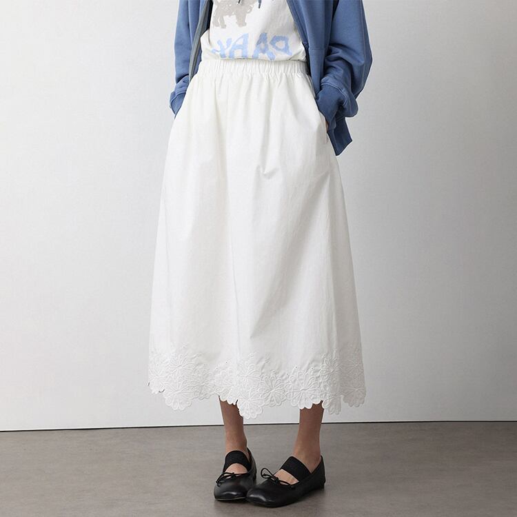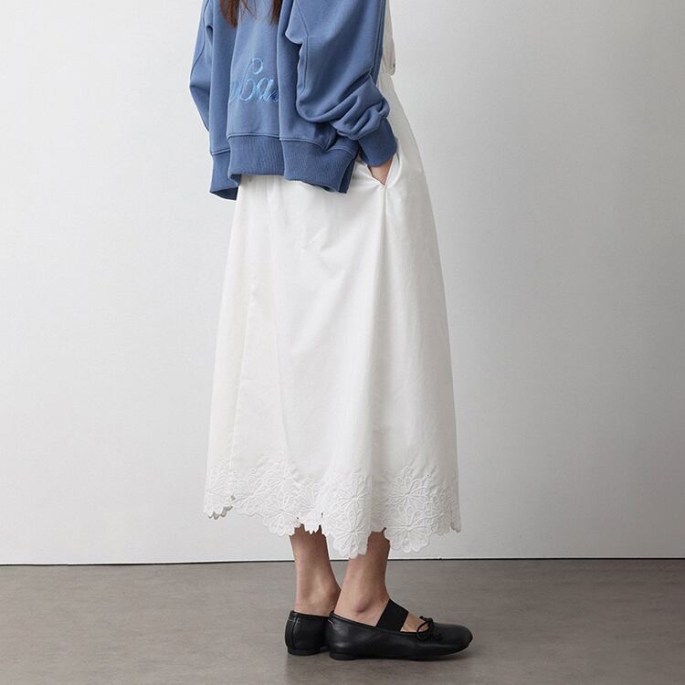 裾にあしらわれた花柄の刺繍レースにスカラップ(波型)カットが上品なアクセントになったロングスカート。やわらかな肌触りと程よいハリ感で美しいAラインシルエットを演出。ウエストは総ゴム仕様でストレスフリーな履き心地を実現。ナチュラルコーデやカジュアルスタイルに合わせやすい、大人女性におすすめのロングスカートです。 【サイズ】 M:ウエスト62-70cm / ヒップ130cm / 裾154cm / スカート丈81cm L:ウエスト66-74cm / ヒップ134cm / 裾158cm / スカート丈82cm *モデル身長168cm(Mサイズ着用) 【カラー】 ホワイト / ブラック 【素材】 表地:コットン100% 裏地:コットン100% 【注意事項】 ・タイミングによっては商品在庫切れにより、注文キャンセルとさせていただく恐れもございますので、予めご了承くださいませ。 ・こちらは輸入品となります。日本製とは検品基準が異なる為、新品未使用品でもごくわずかな汚れやほつれがある場合もございます。 ・仕入れ工場を変えることがあるため、記載サイズと若干異なる場合がございます。 ・商品の色味は、お手持ちのスマートフォン画面によって実物と若干異なる場合がございます。 ・イメージ違いやサイズ交換等、お客さまご都合による交換、返品は対応出来かねます。 ■選べるお支払い方法 ・クレジットカード決済(VISA/Master/JCB/AMEX) ・Amazon pay ・キャリア決済(docomo/au/Softbank/Y!mobile) ・あと払いPayID ■お届けについて こちらの商品は海外店舗より直接発送となる為、 ご入金から10日~3週間前後での発送となります。 ↓ご購入前にこちらをお読みください https://closetly.shopselect.net/about