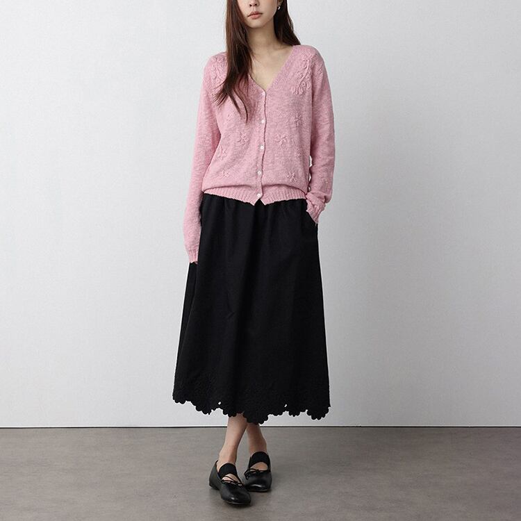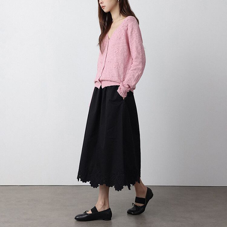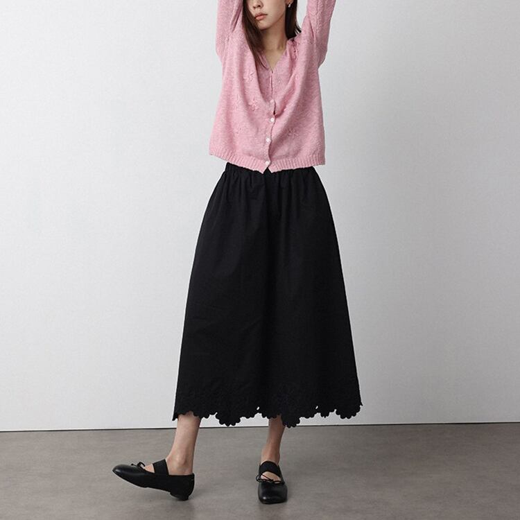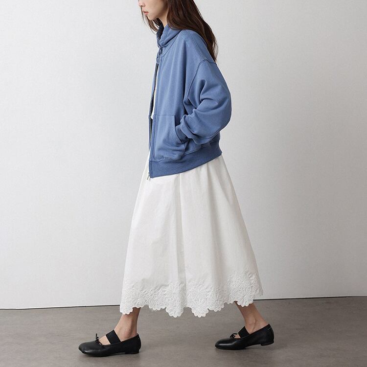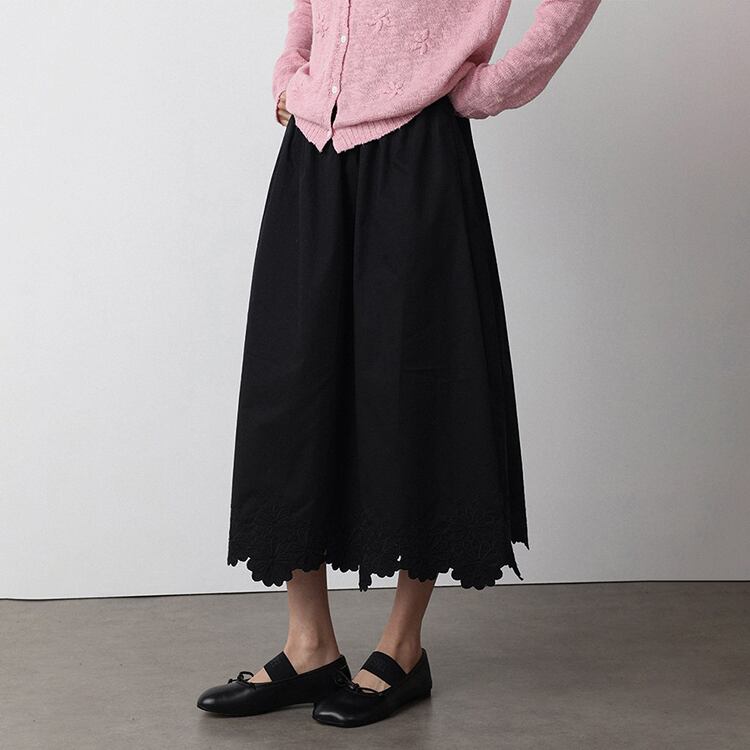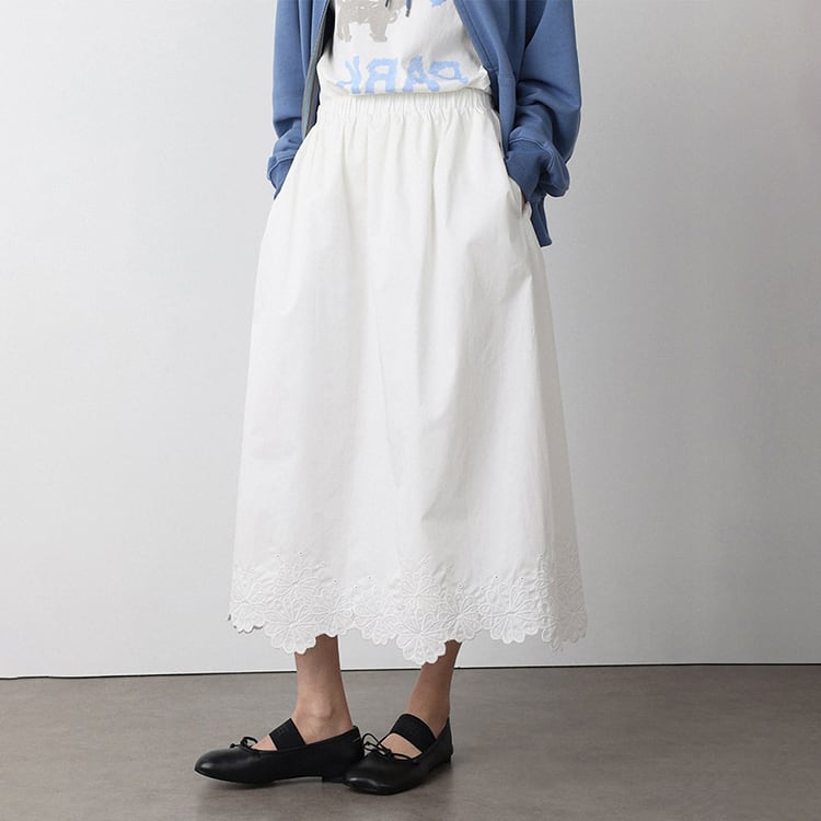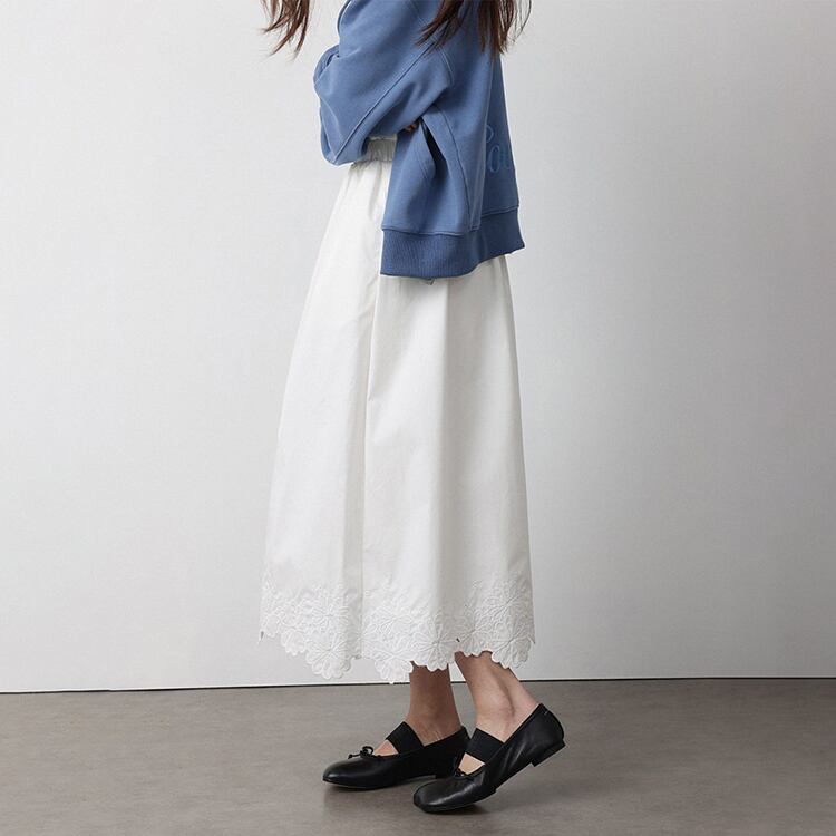 裾にあしらわれた花柄の刺繍レースにスカラップ(波型)カットが上品なアクセントになったロングスカート。やわらかな肌触りと程よいハリ感で美しいAラインシルエットを演出。ウエストは総ゴム仕様でストレスフリーな履き心地を実現。ナチュラルコーデやカジュアルスタイルに合わせやすい、大人女性におすすめのロングスカートです。 【サイズ】 M:ウエスト62-70cm / ヒップ130cm / 裾154cm / スカート丈81cm L:ウエスト66-74cm / ヒップ134cm / 裾158cm / スカート丈82cm *モデル身長168cm(Mサイズ着用) 【カラー】 ホワイト / ブラック 【素材】 表地:コットン100% 裏地:コットン100% 【注意事項】 ・タイミングによっては商品在庫切れにより、注文キャンセルとさせていただく恐れもございますので、予めご了承くださいませ。 ・こちらは輸入品となります。日本製とは検品基準が異なる為、新品未使用品でもごくわずかな汚れやほつれがある場合もございます。 ・仕入れ工場を変えることがあるため、記載サイズと若干異なる場合がございます。 ・商品の色味は、お手持ちのスマートフォン画面によって実物と若干異なる場合がございます。 ・イメージ違いやサイズ交換等、お客さまご都合による交換、返品は対応出来かねます。 ■選べるお支払い方法 ・クレジットカード決済(VISA/Master/JCB/AMEX) ・Amazon pay ・キャリア決済(docomo/au/Softbank/Y!mobile) ・あと払いPayID ■お届けについて こちらの商品は海外店舗より直接発送となる為、 ご入金から10日~3週間前後での発送となります。 ↓ご購入前にこちらをお読みください https://closetly.shopselect.net/about