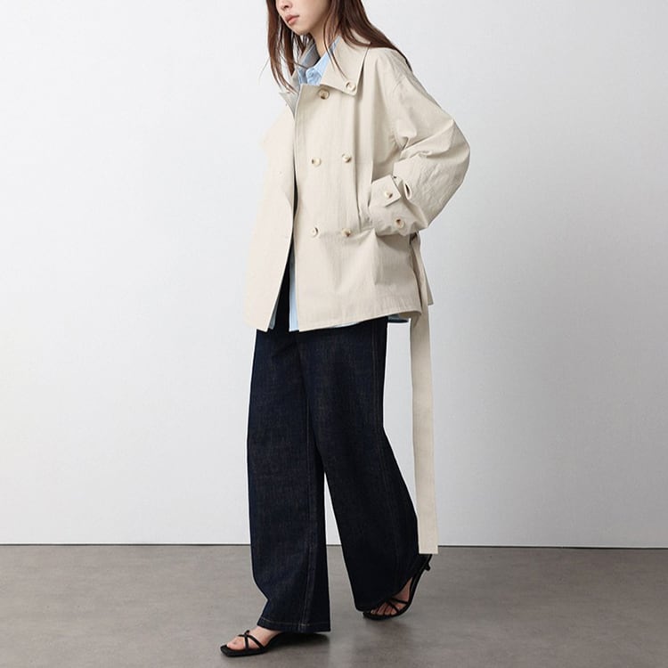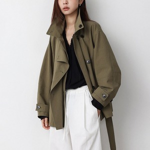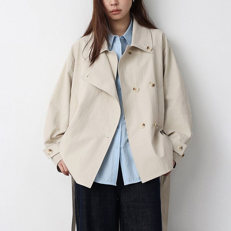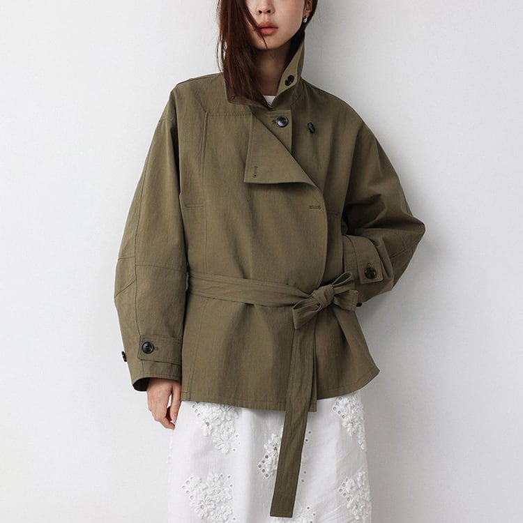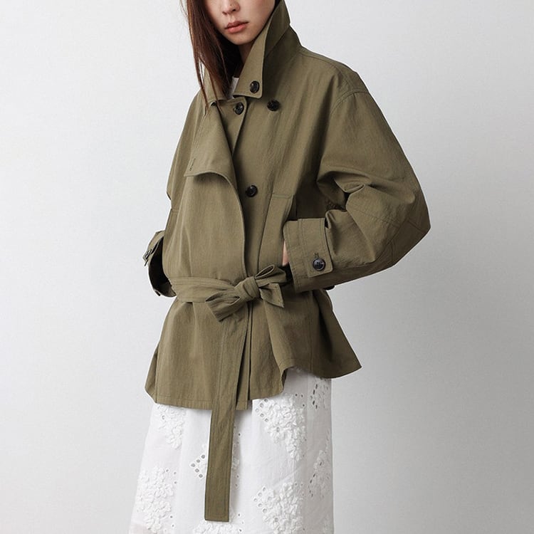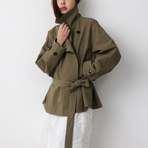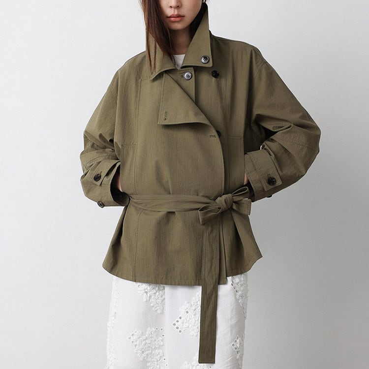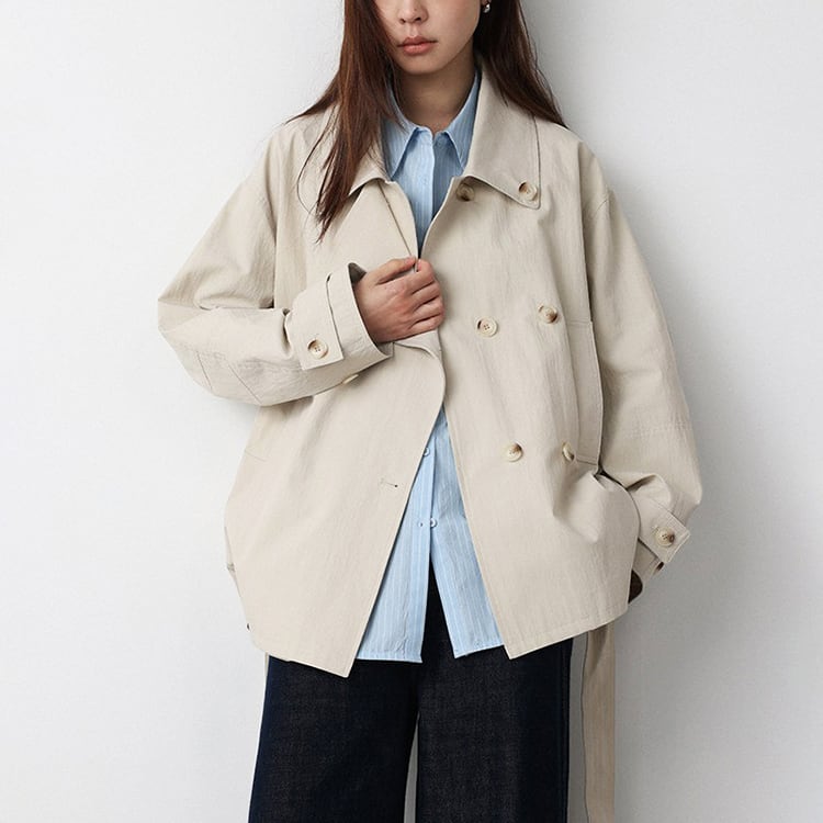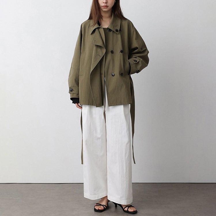 春先のコーディネートにぴったりな、ショート丈のトレンチコート。顔まわりをすっきり見せる襟デザインと、ダブル風のフロントデザインとベルト付。ゆるく羽織ればカジュアルな雰囲気に、ウエストベルトを結べば女性らしいシルエットに。通勤スタイルから休日のお出かけまで幅広く着回しできるアイテムです。 【サイズ】 M:肩幅52cm / バスト140cm / 袖丈53cm / 袖口31cm / 裾138cm / 着丈70cm L:肩幅53cm / バスト144cm / 袖丈54cm / 袖口32cm / 裾142cm / 着丈71cm *モデル身長168cm(Mサイズ着用) 【カラー】 カーキグリーン / ライトベージュ 【素材】 コットン86% ナイロン14% 【注意事項】 ・タイミングによっては商品在庫切れにより、注文キャンセルとさせていただく恐れもございますので、予めご了承くださいませ。 ・こちらは輸入品となります。日本製とは検品基準が異なる為、新品未使用品でもごくわずかな汚れやほつれがある場合もございます。 ・仕入れ工場を変えることがあるため、記載サイズと若干異なる場合がございます。 ・商品の色味は、お手持ちのスマートフォン画面によって実物と若干異なる場合がございます。 ・イメージ違いやサイズ交換等、お客さまご都合による交換、返品は対応出来かねます。 ■選べるお支払い方法 ・クレジットカード決済(VISA/Master/JCB/AMEX) ・Amazon pay ・キャリア決済(docomo/au/Softbank/Y!mobile) ・あと払いPayID ■お届けについて こちらの商品は海外店舗より直接発送となる為、 ご入金から10日~3週間前後での発送となります。 ↓ご購入前にこちらをお読みください https://closetly.shopselect.net/about