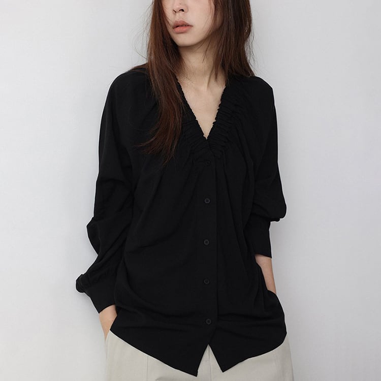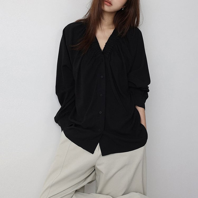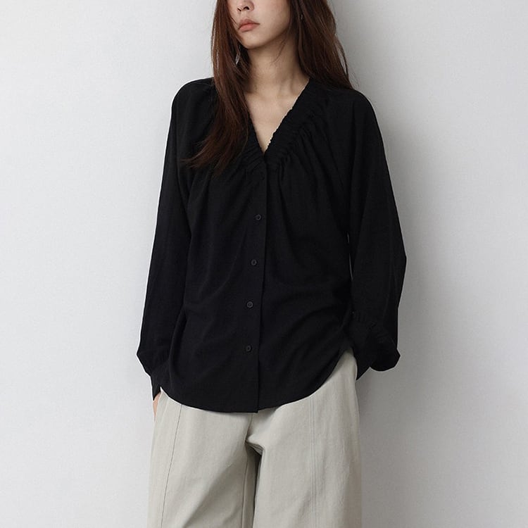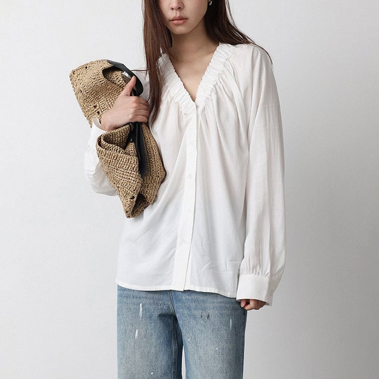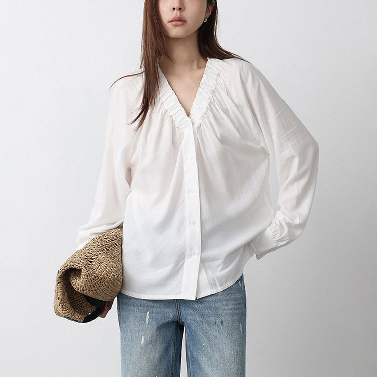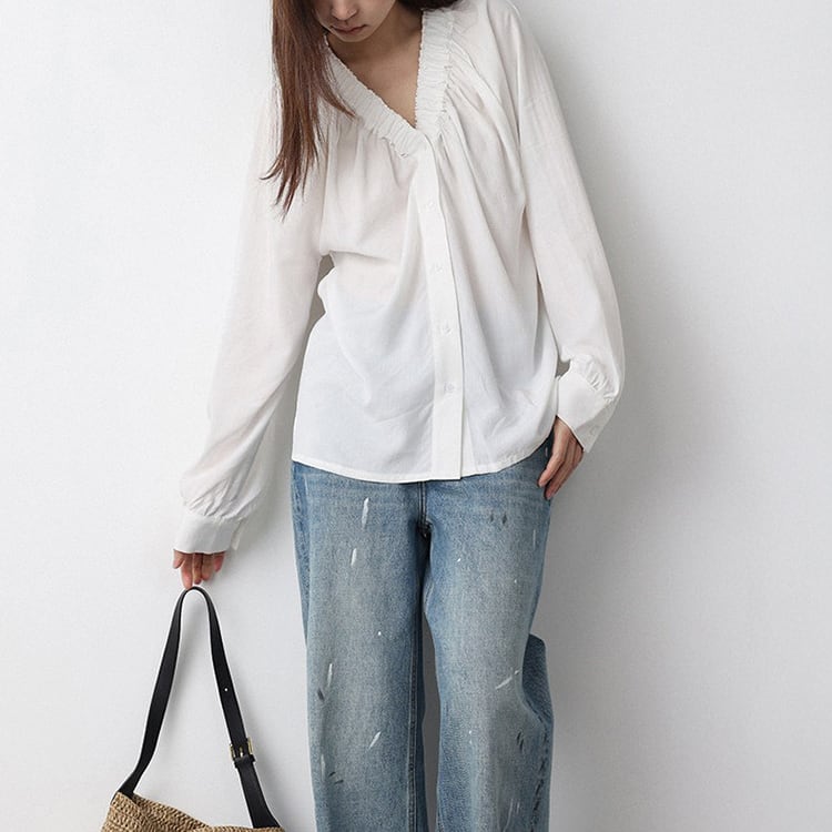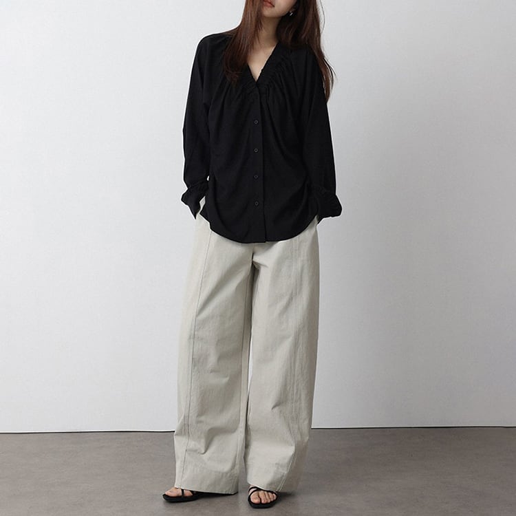 Vネック周りに細かいギャザーが魅力的な、Vネックブラウス。テンセル混素材のやわらかなとろみ生地が、上品なドレープを生み出し、肌触りが良く快適。ゆったりとしたシルエットで体型カバーも叶え、サイドスリット入りの裾デザインで、動きやすさとこなれ感をプラス。オフィスカジュアルや休日コーデにもおすすめ、幅広いコーデに合わせやすい一枚です。 【サイズ】 M:裄丈70cm / バスト108cm / 袖口23cm / 裾106cm / 着丈66cm L:裄丈71cm / バスト112cm / 袖口24cm / 裾110cm / 着丈67cm *モデル身長168cm(Lサイズ着用) 【カラー】 ホワイト / ブラック 【素材】 レーヨン70% テンセル30% 【注意事項】 ・タイミングによっては商品在庫切れにより、注文キャンセルとさせていただく恐れもございますので、予めご了承くださいませ。 ・こちらは輸入品となります。日本製とは検品基準が異なる為、新品未使用品でもごくわずかな汚れやほつれがある場合もございます。 ・仕入れ工場を変えることがあるため、記載サイズと若干異なる場合がございます。 ・商品の色味は、お手持ちのスマートフォン画面によって実物と若干異なる場合がございます。 ・イメージ違いやサイズ交換等、お客さまご都合による交換、返品は対応出来かねます。 ■選べるお支払い方法 ・クレジットカード決済(VISA/Master/JCB/AMEX) ・Amazon pay ・キャリア決済(docomo/au/Softbank/Y!mobile) ・あと払いPayID ■お届けについて こちらの商品は海外店舗より直接発送となる為、 ご入金から10日~3週間前後での発送となります。 ↓ご購入前にこちらをお読みください https://closetly.shopselect.net/about