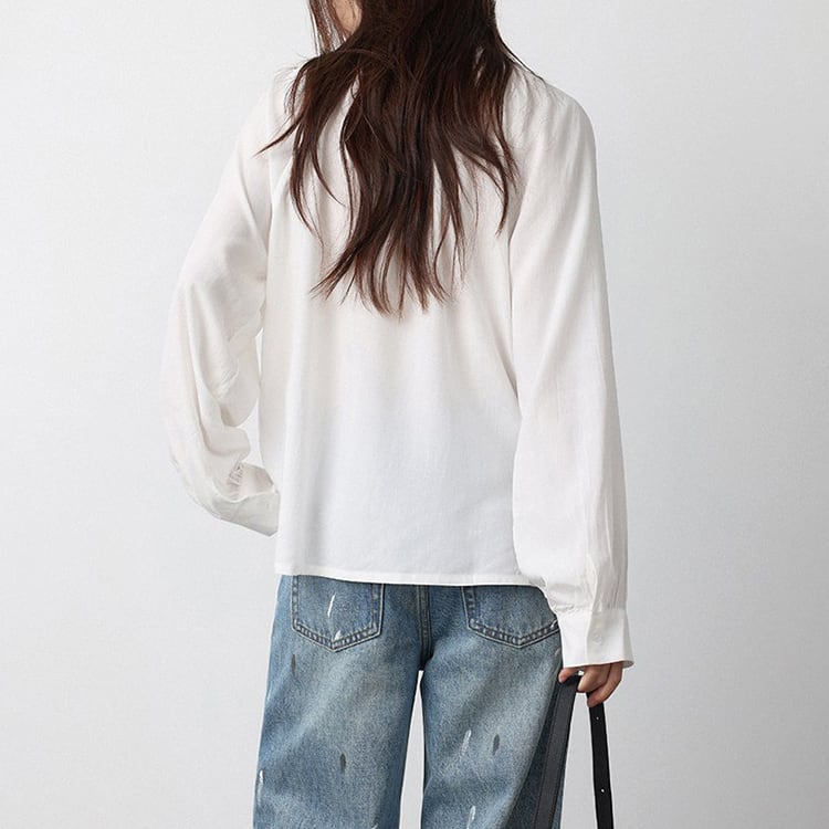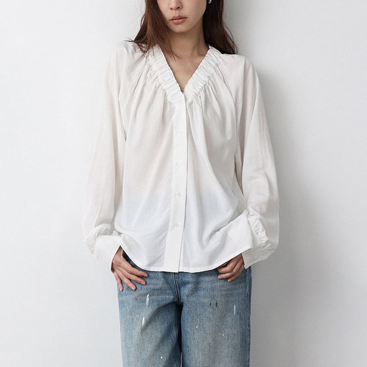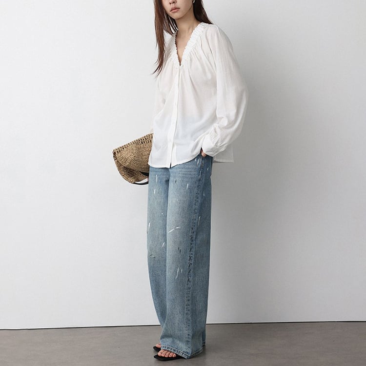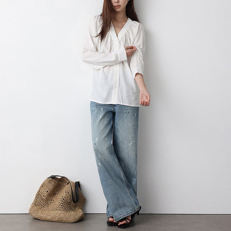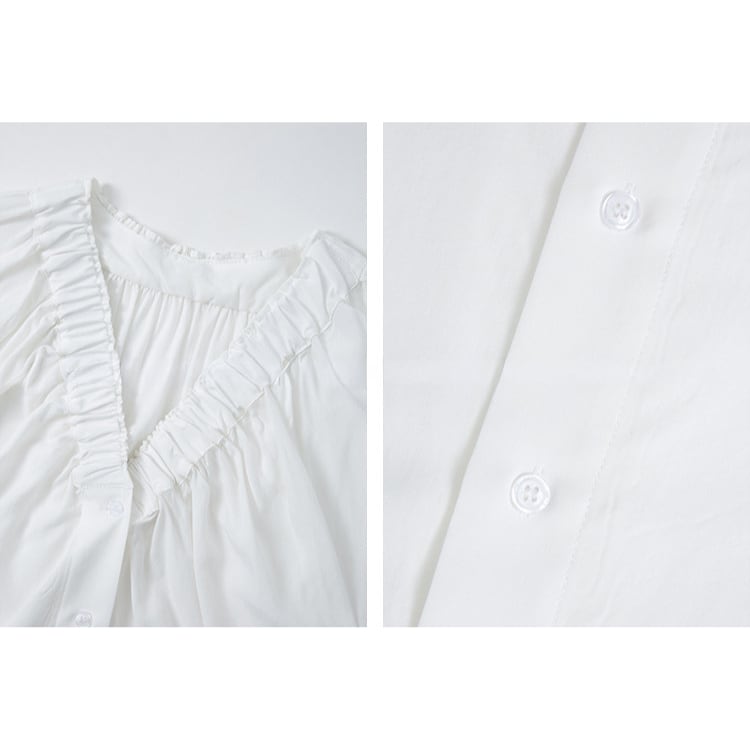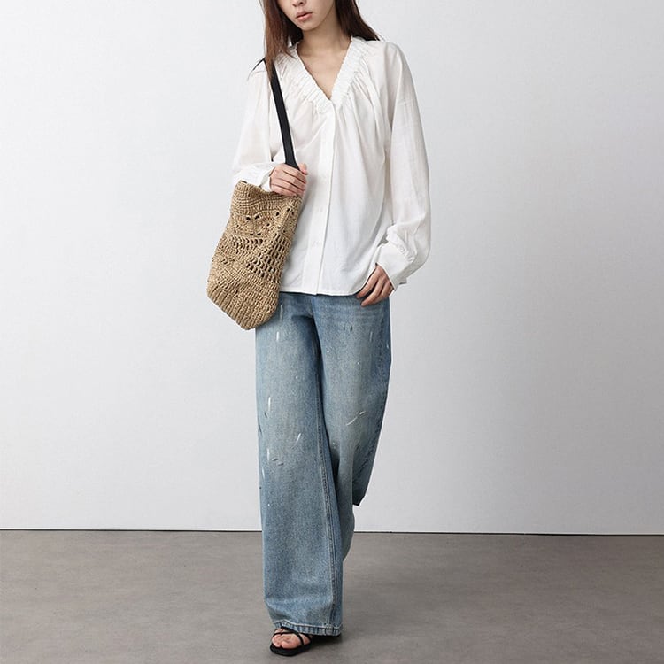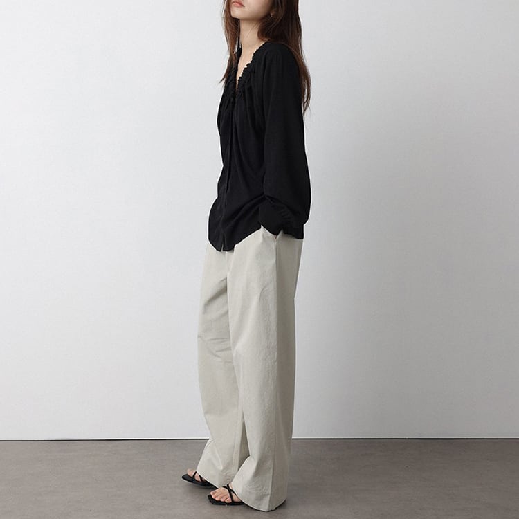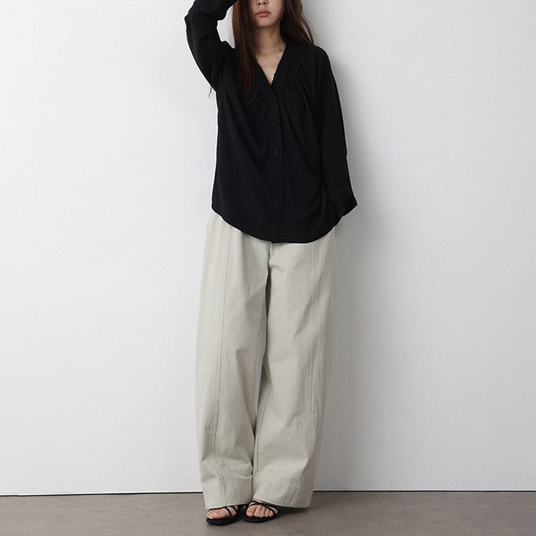 Vネック周りに細かいギャザーが魅力的な、Vネックブラウス。テンセル混素材のやわらかなとろみ生地が、上品なドレープを生み出し、肌触りが良く快適。ゆったりとしたシルエットで体型カバーも叶え、サイドスリット入りの裾デザインで、動きやすさとこなれ感をプラス。オフィスカジュアルや休日コーデにもおすすめ、幅広いコーデに合わせやすい一枚です。 【サイズ】 M:裄丈70cm / バスト108cm / 袖口23cm / 裾106cm / 着丈66cm L:裄丈71cm / バスト112cm / 袖口24cm / 裾110cm / 着丈67cm *モデル身長168cm(Lサイズ着用) 【カラー】 ホワイト / ブラック 【素材】 レーヨン70% テンセル30% 【注意事項】 ・タイミングによっては商品在庫切れにより、注文キャンセルとさせていただく恐れもございますので、予めご了承くださいませ。 ・こちらは輸入品となります。日本製とは検品基準が異なる為、新品未使用品でもごくわずかな汚れやほつれがある場合もございます。 ・仕入れ工場を変えることがあるため、記載サイズと若干異なる場合がございます。 ・商品の色味は、お手持ちのスマートフォン画面によって実物と若干異なる場合がございます。 ・イメージ違いやサイズ交換等、お客さまご都合による交換、返品は対応出来かねます。 ■選べるお支払い方法 ・クレジットカード決済(VISA/Master/JCB/AMEX) ・Amazon pay ・キャリア決済(docomo/au/Softbank/Y!mobile) ・あと払いPayID ■お届けについて こちらの商品は海外店舗より直接発送となる為、 ご入金から10日~3週間前後での発送となります。 ↓ご購入前にこちらをお読みください https://closetly.shopselect.net/about