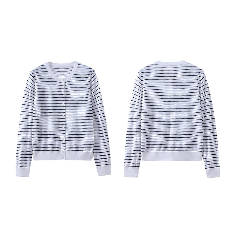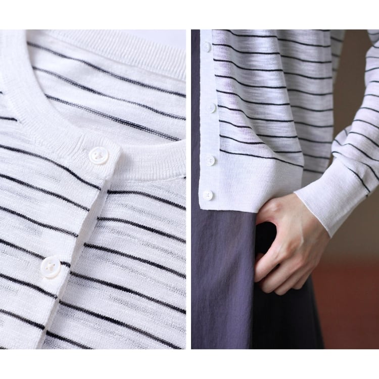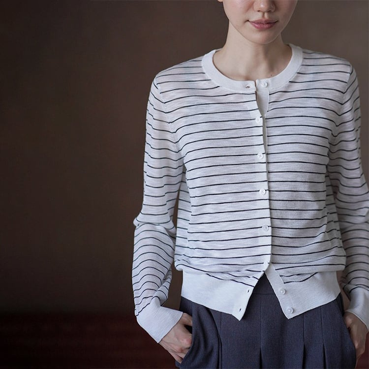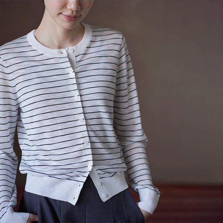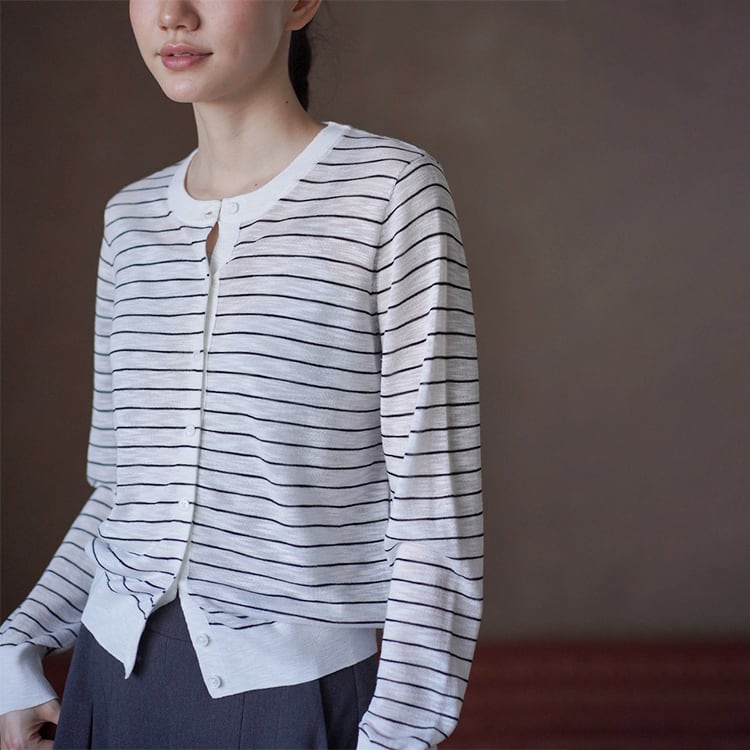 爽やかなフレンチボーダーが印象的なニットカーディガン。柔らかく通気性に優れた素材を使用しており、汗ばむ季節でも快適に過ごせるのがポイントです。また軽く羽織れる薄手仕様で、冷房対策や日焼け防止にも◎細めのボーダー柄が上品さを演出。ボタンを閉めてトップスとしても、羽織りとしても使える、季節の変わり目にも重宝する万能アイテムです。