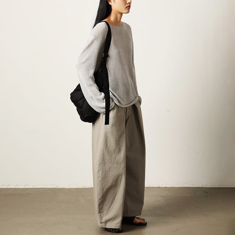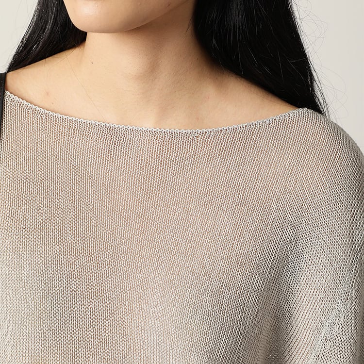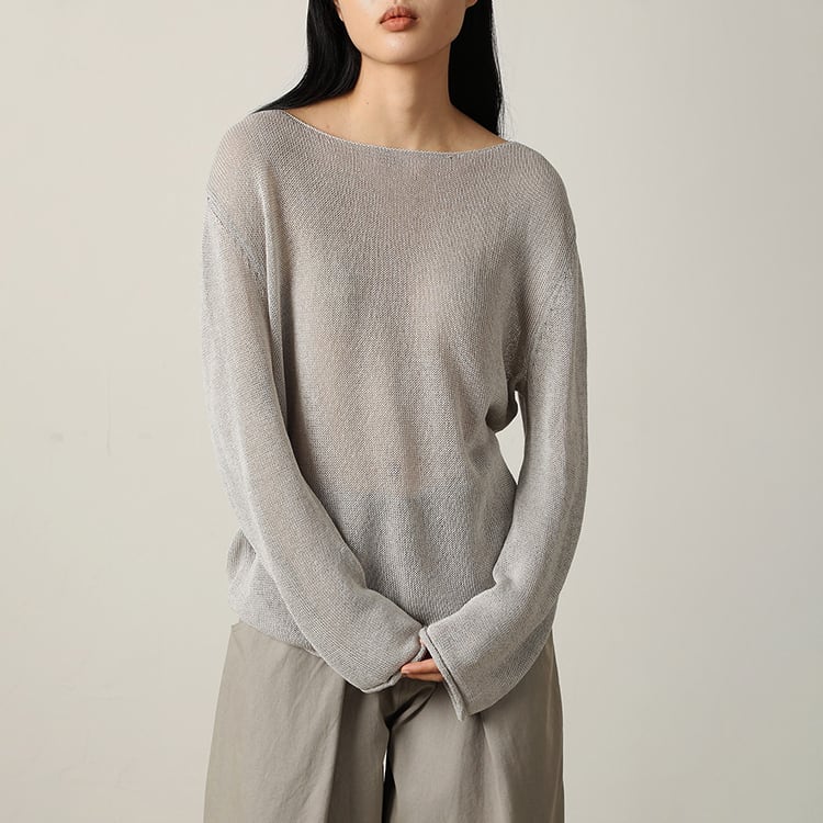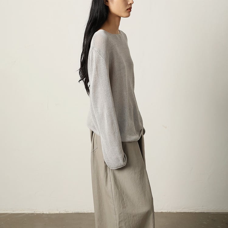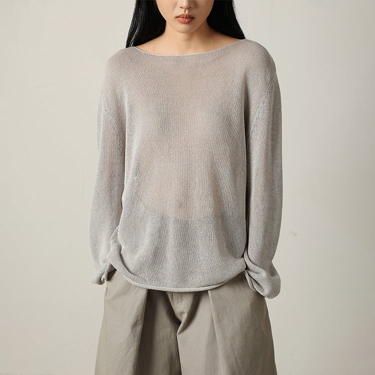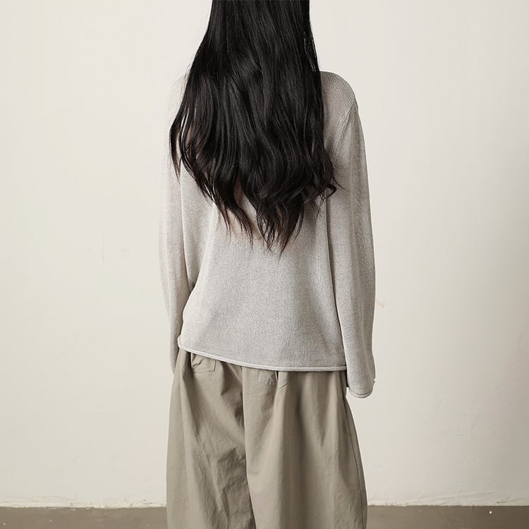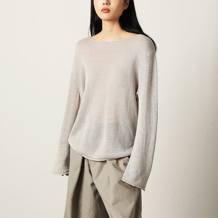柔らかな肌触りと軽やかさが魅力の薄手ニットトップス。裾と袖口はロールエッジデザインに、程よく開いたネックラインがが首元を美しく見せ、女性らしい雰囲気に。薄手なのでインナーとのレイヤードも楽しめ、気取らない大人のカジュアルスタイルにぴったりな一枚です。