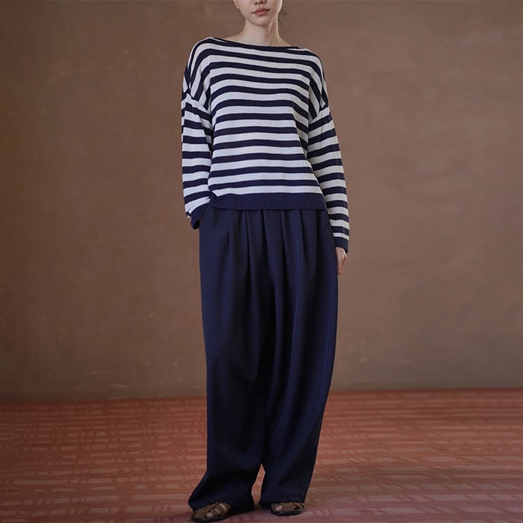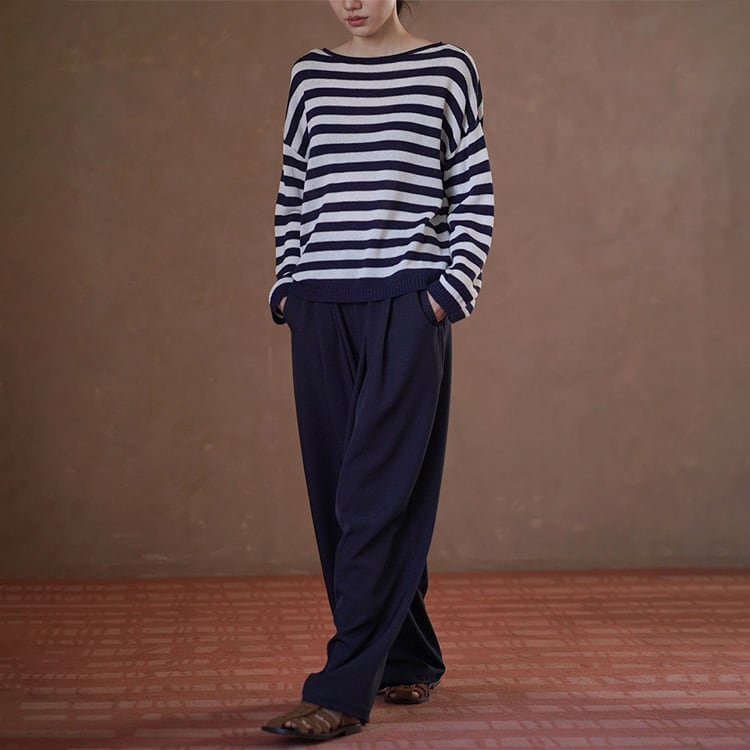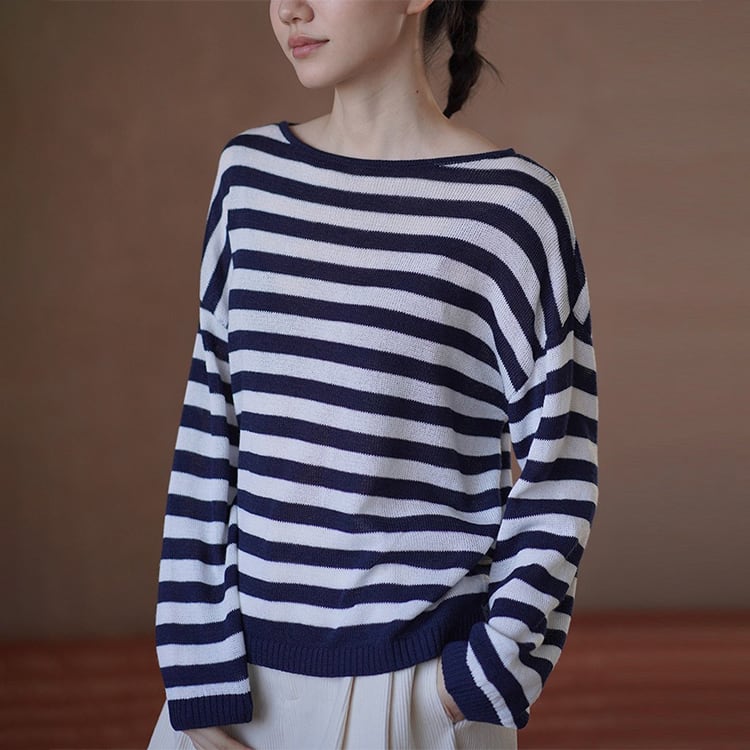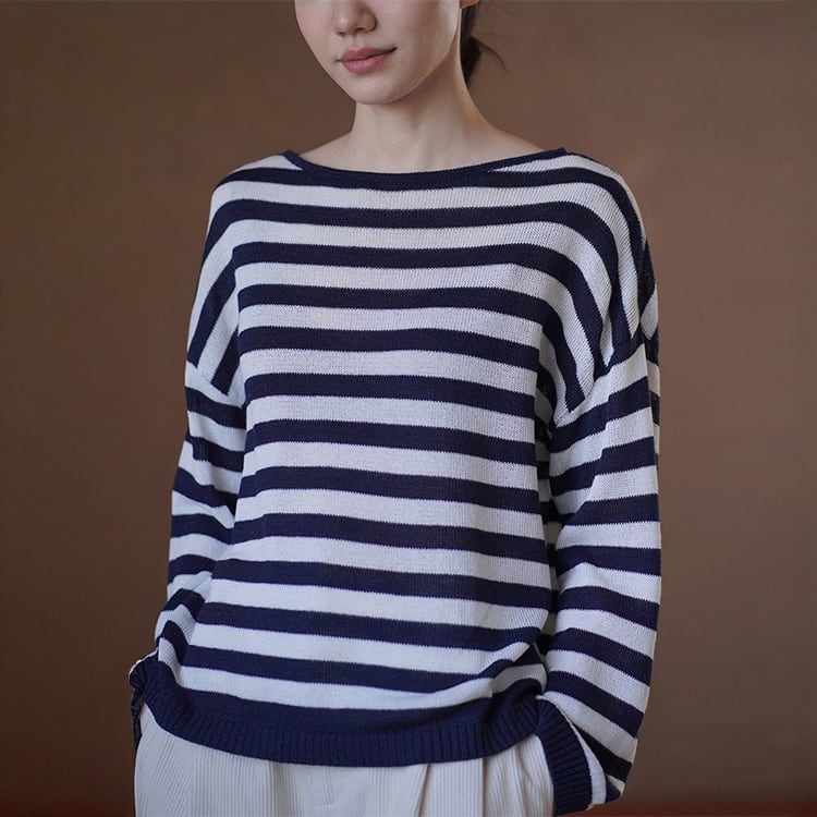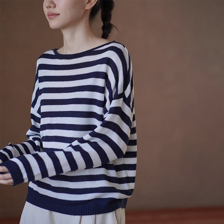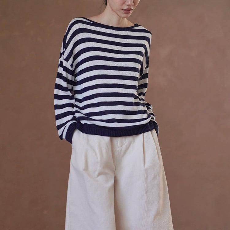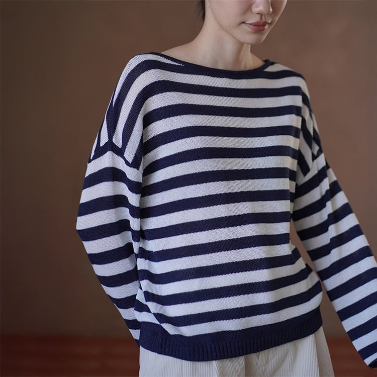 定番のボーダーデザインを、柔らかさ・通気性・軽さを兼ね備えた素材で作られた快適なボーダーニットトップス。和紙繊維を取り入れることで、さらっとした着心地を実現。ボートネックがデコルテを美しく魅せ、ゆったりとしたフォルムで抜け感を演出しつつ、上品さもキープ。ベーシックなデザインだからこそ、長く愛用でき、カジュアルにもきれいめにも対応し、着回し力抜群の一枚です。