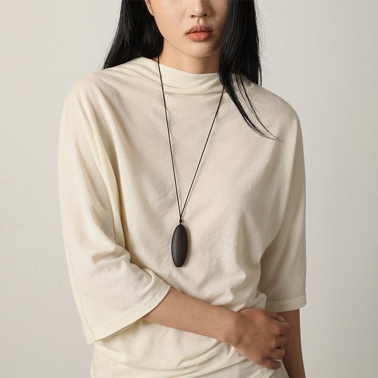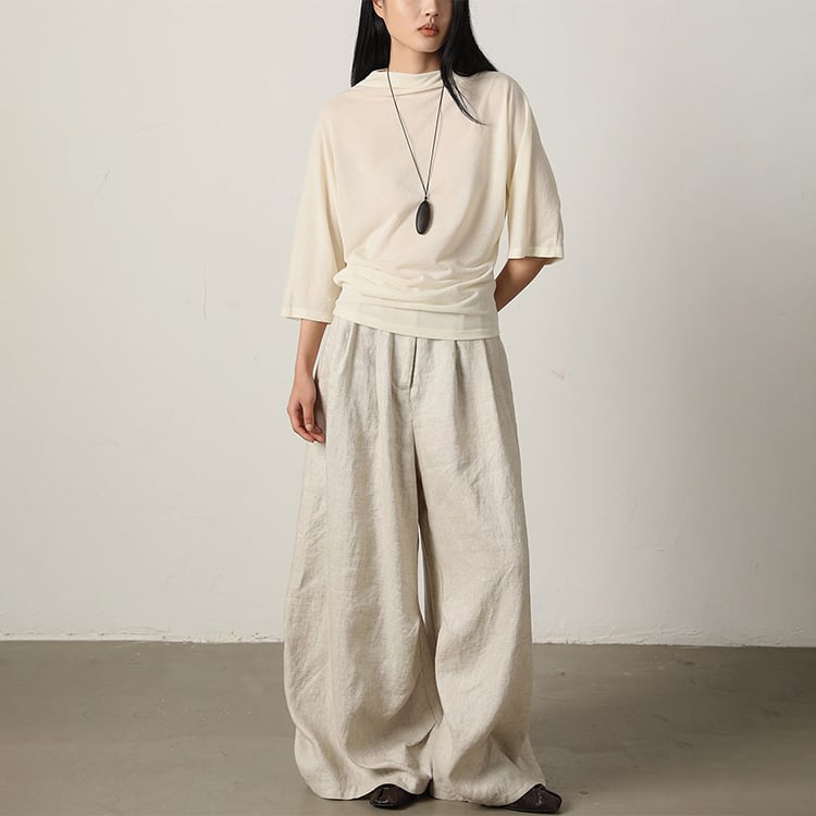 柔らかなニット素材の五分袖カットソー。ゆったりとしたドルマンスリーブから、ウエストにかけて緩やかにシェイプされたデザインに、ドレープ感のあるボトルネックが、女性らしいメリハリのあるシルエットを演出。程よくゆとりのあるシルエットと、ウエストのホールド感のバランスが絶妙。どんな体型の方でもスッキリと着こなせる一枚です。