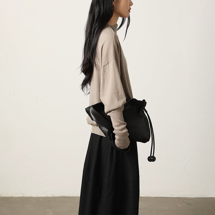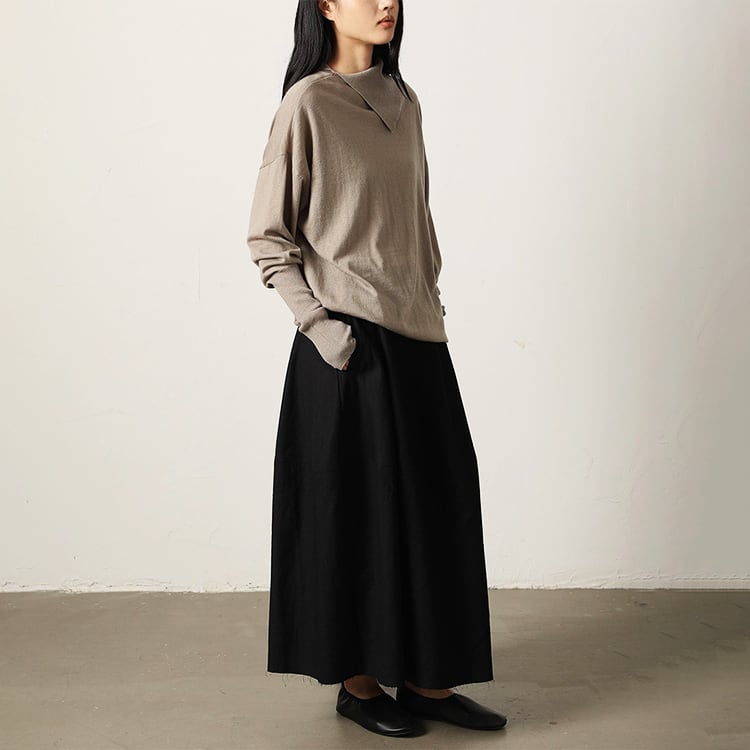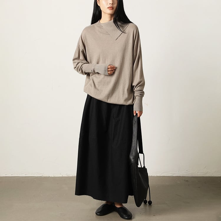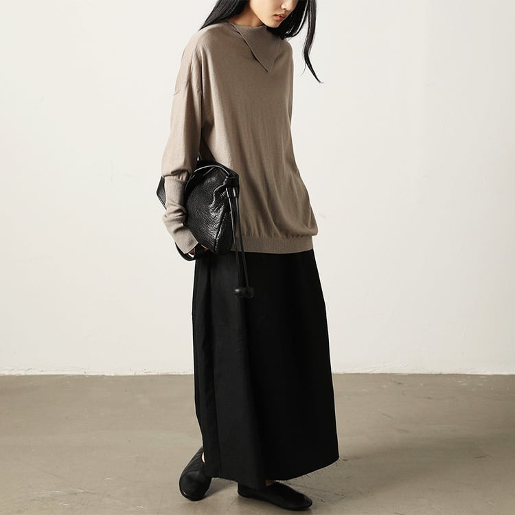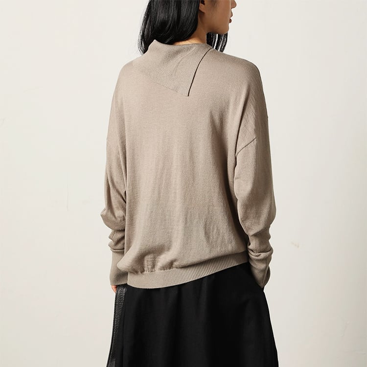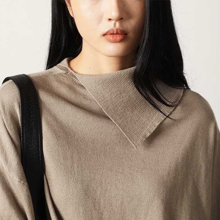 上質素材を使用した、なめらかな肌触りが魅力のニットトップス。片側だけ重なるアシンメトリーネックデザインが、他にはない上品なアクセントに。長めの袖とゆったりとしたシルエットで体型カバーも叶え、落ち感のある素材で自然なドレープが生まれ、大人の抜け感スタイルを演出。ミニマルなデザインで幅広いスタイリングに対応するニットです。