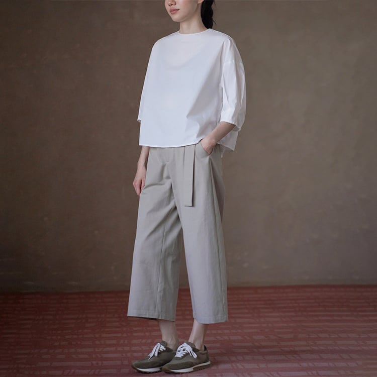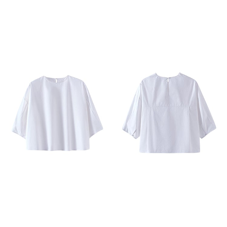 コットン100%のやさしい肌触りが魅力の七分袖ブラウス。通気性に優れ、汗ばむ季節でもさらりと快適な着心地をキープ。首元と袖口には繊細な 刺繍レースを施し、シンプルながら女性らしい上品さをプラス。ゆったりとしたドロップショルダーシルエットで体型カバーしつつ、抜け感のある大人スタイルを演出。デイリー使いはもちろん、オフィスカジュアルにもおすすめの一枚です。