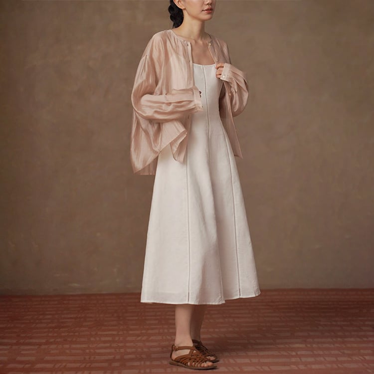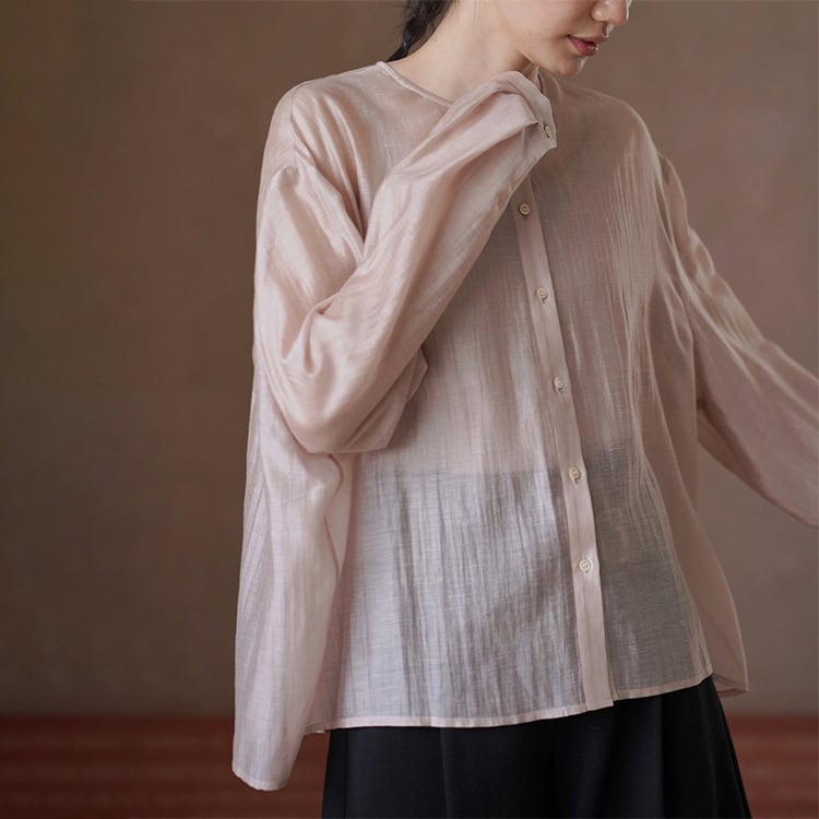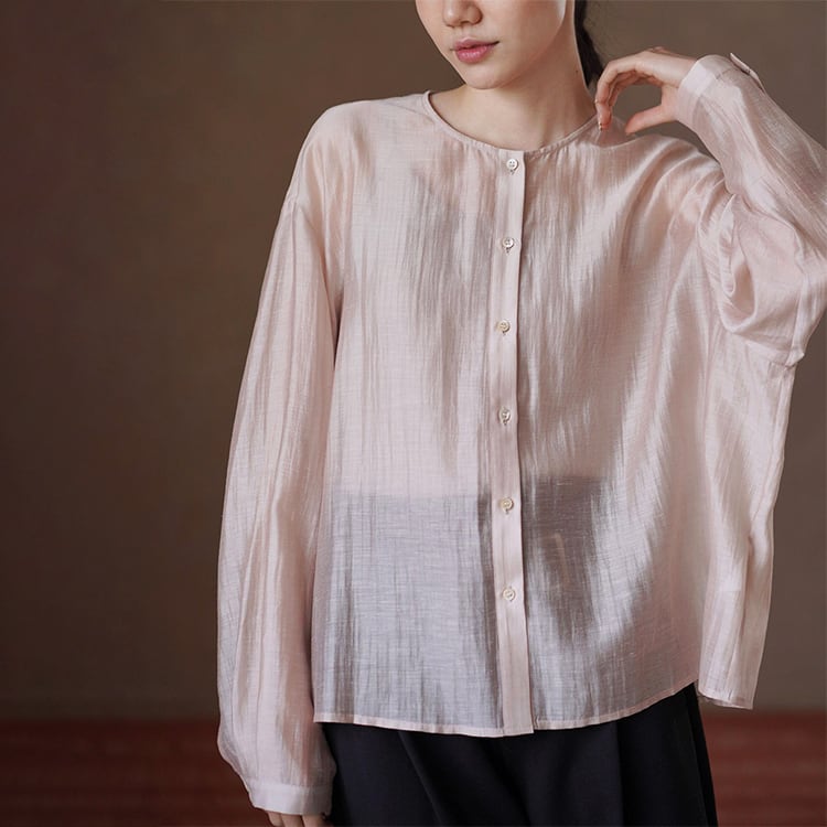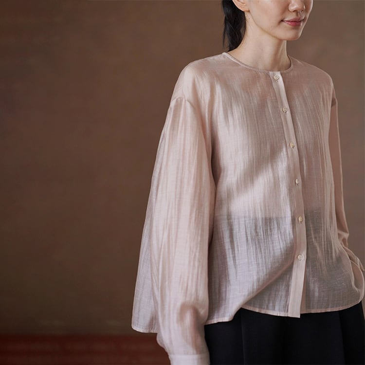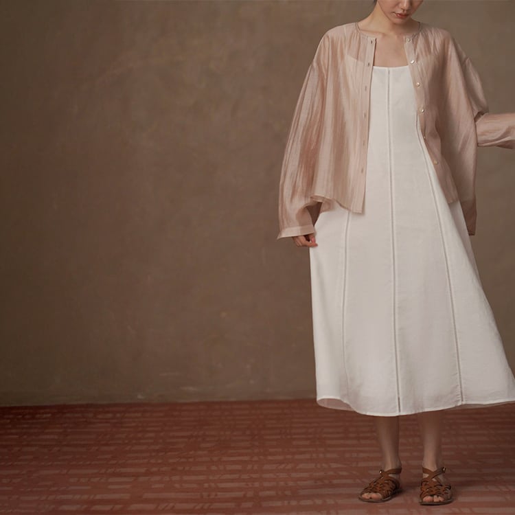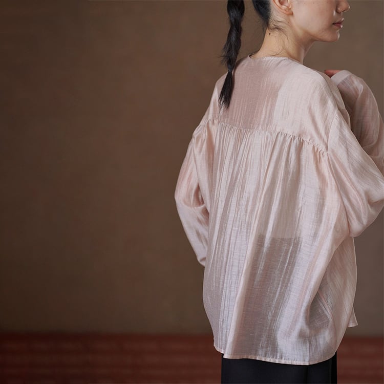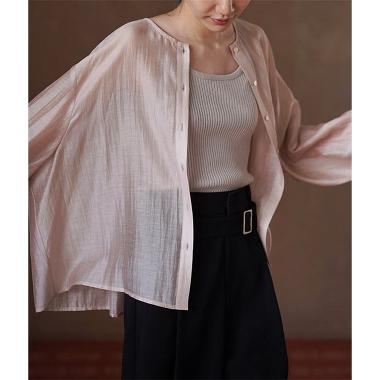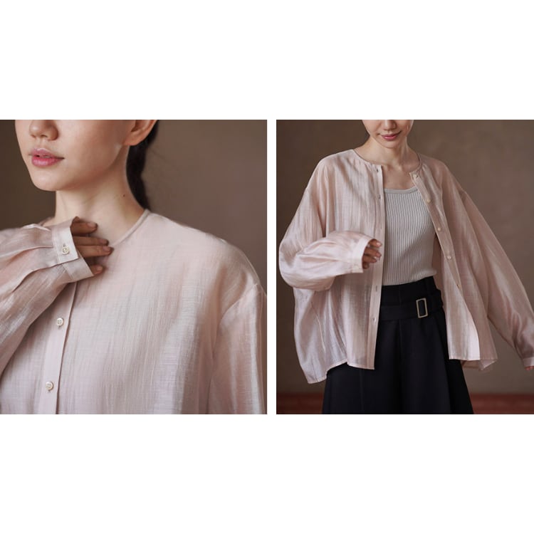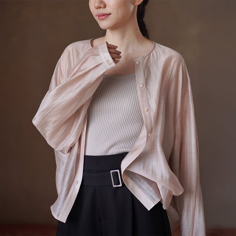 テンセルの滑らかさとリネンの清涼感を贅沢にブレンドしたノーカラーブラウス。ゆったりとしたオーバーサイズとドロップショルダーが、気になる肩周りや二の腕を自然にカバー。後ろ身頃のギャザーが立体感を生み出し、柔らかなサテン調の光沢、シアー感があるため重たくならず、とろみのある落ち感が魅力。夏の冷房対策や日焼け防止の羽織りとしても重宝する一枚です。