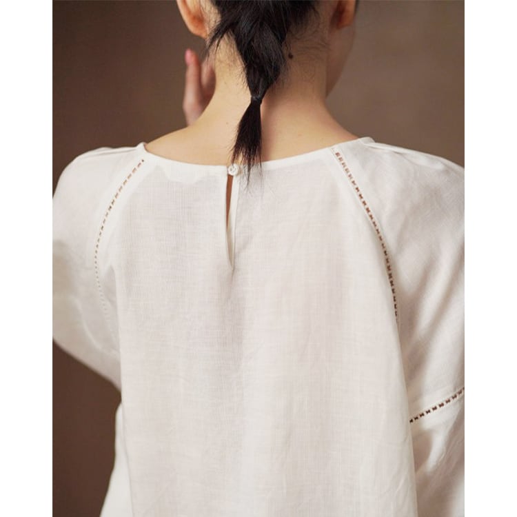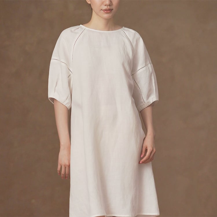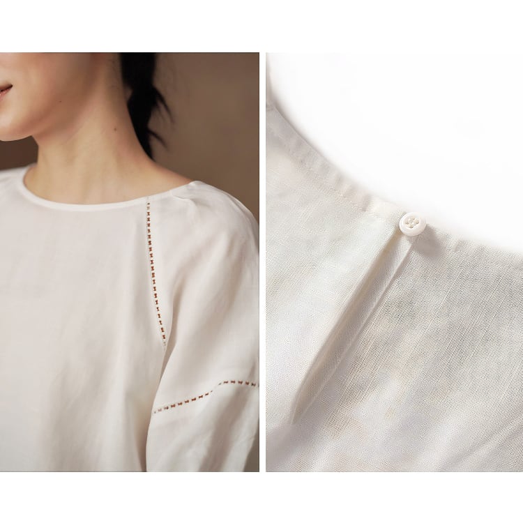 ナチュラルな風合いが魅力のリヨセル、リネン素材チュニック。肩から袖にかけて、さりげない透かし刺繡デザインを施し、上品なアクセントをプラス。パフスリーブにゆったりとしたAラインシルエットで、気になる体型を自然にカバーしながら、すっきりとした印象に。シンプルでもおしゃれに決まる、大人のナチュラルスタイルにぴったりな一枚です。