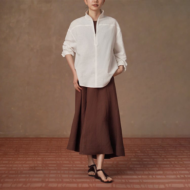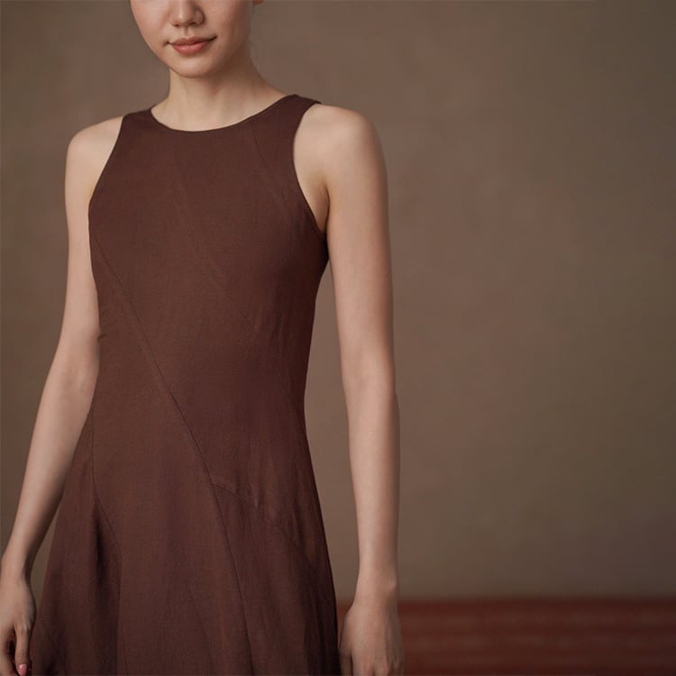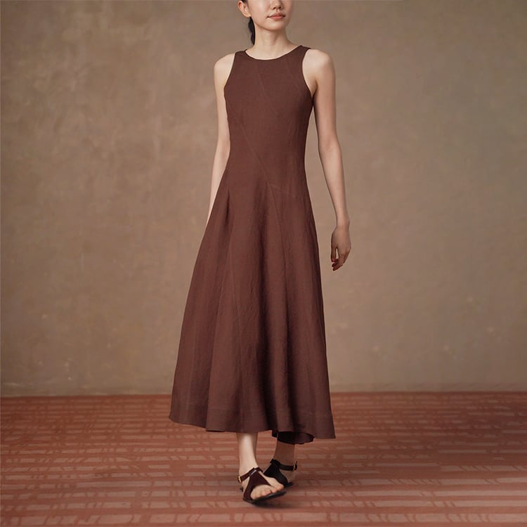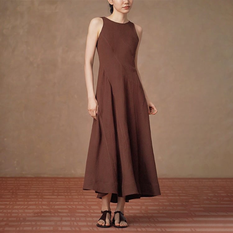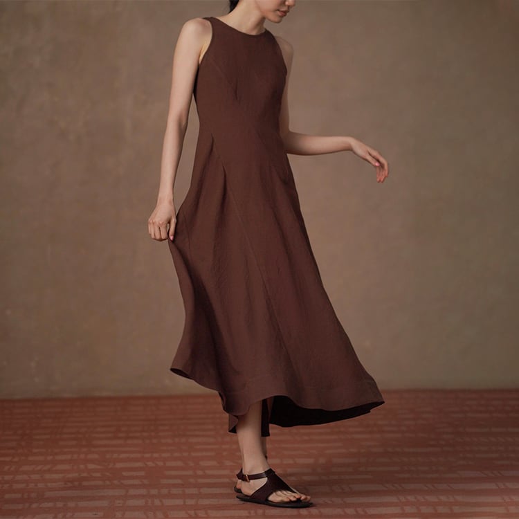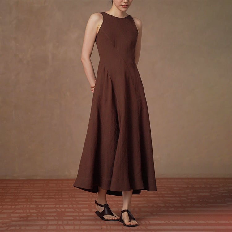 上質なリネン混素材を使用した、ナチュラルな風合いが魅力のAラインワンピース。ノースリーブデザインが肩まわりをすっきり見せ、女性らしいシルエットを演出。パネル切替デザインが自然にスタイルアップを叶え、ふんわり広がるフレアシルエットで体型カバーも◎。夏のワードローブに欠かせない、一枚でサマになる、大人ナチュラルなロングワンピースです。