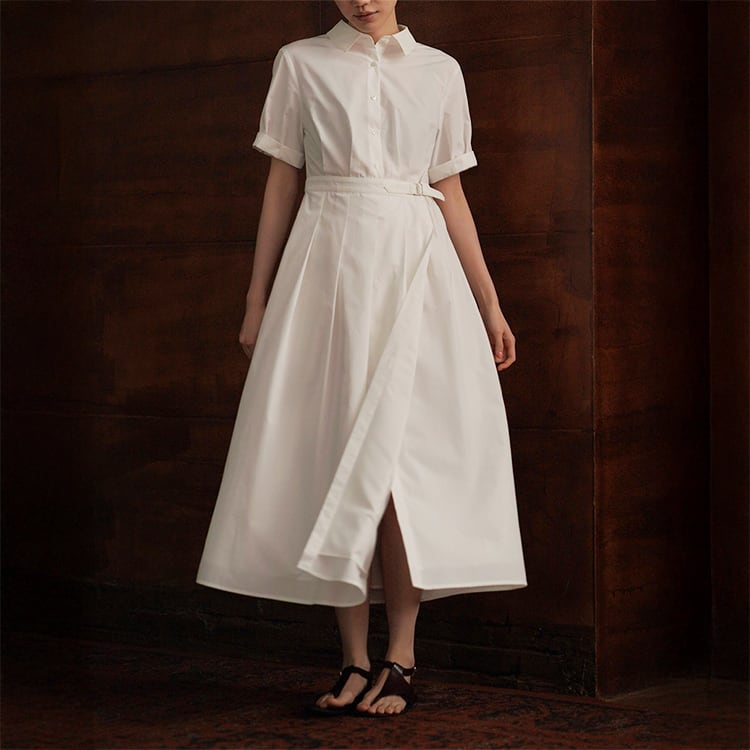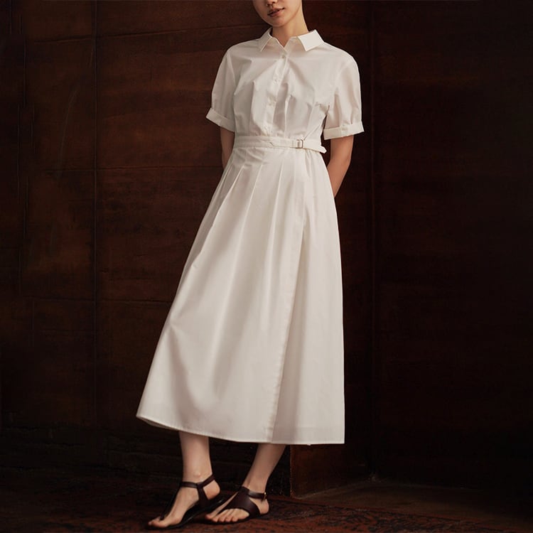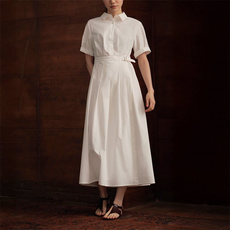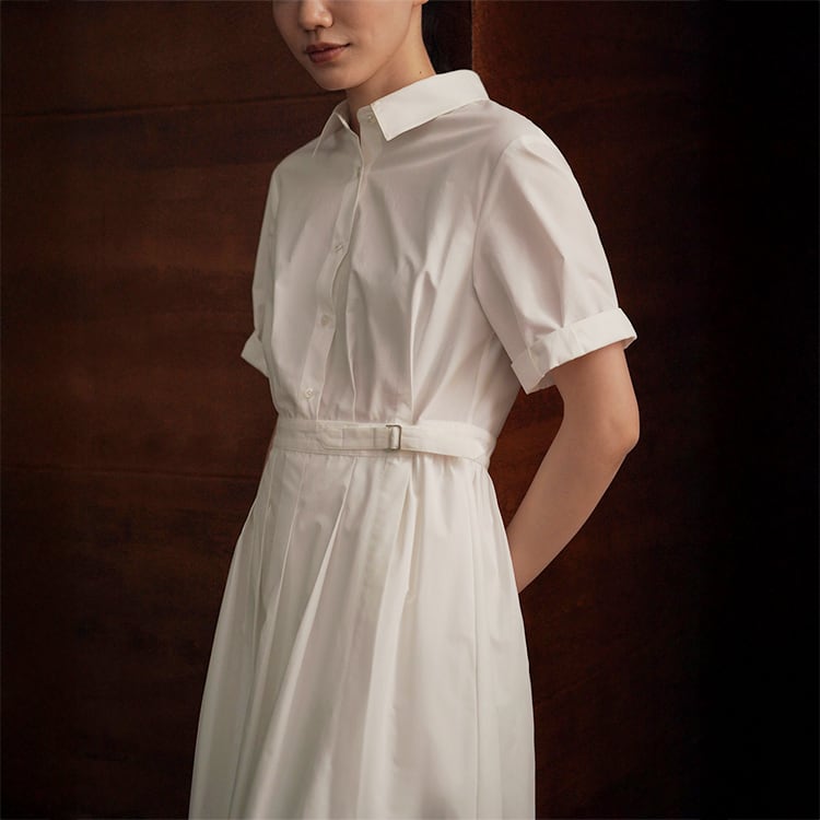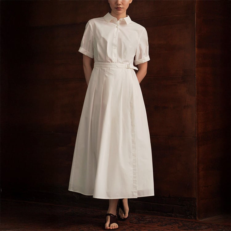 シンプルながら洗練された印象を演出する、ミモレ丈シャツワンピース。クラシックな襟付きデザインが首元をすっきり見せ、きちんと感のあるスタイルに。ウエスト部分には調整ベルトとタックデザインが施され、ラップ風スカートの自然な広がりと、立体感のある美シルエットを演出。ミニマルデザインで大人の女性にぴったりな、一枚でコーデが完成する優秀アイテムです。