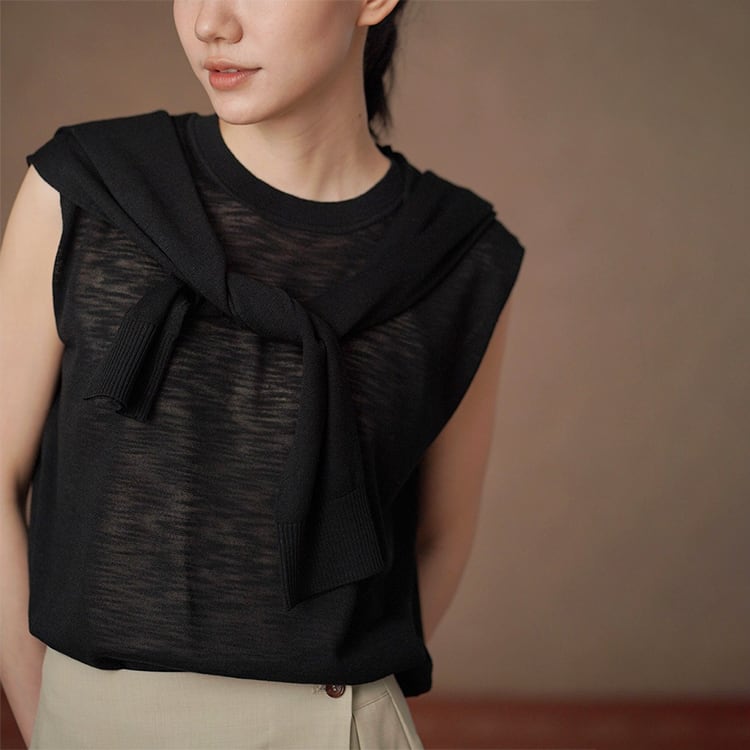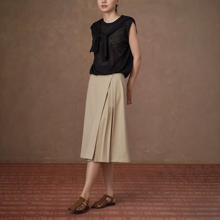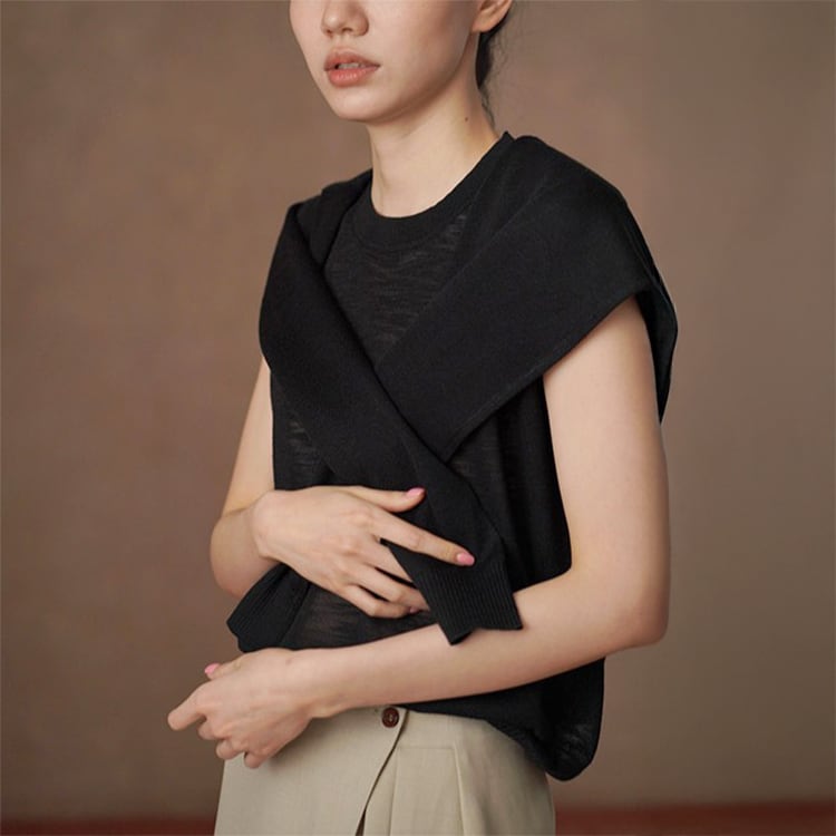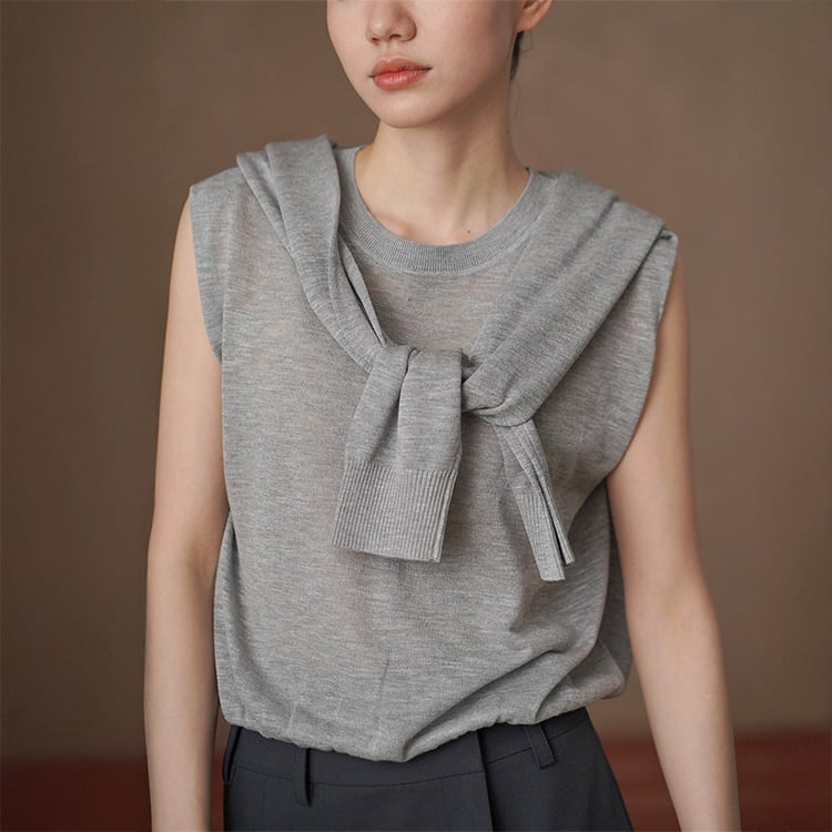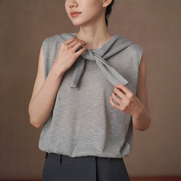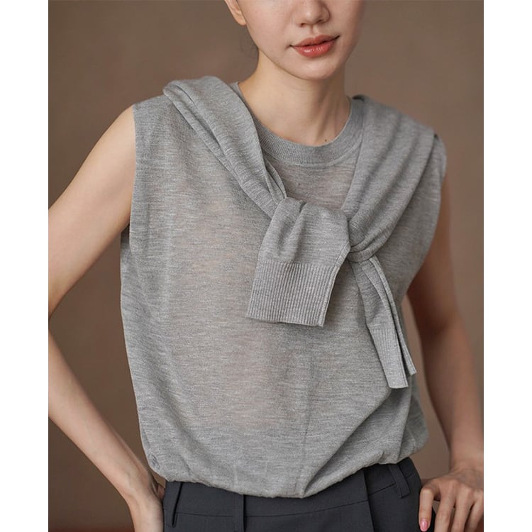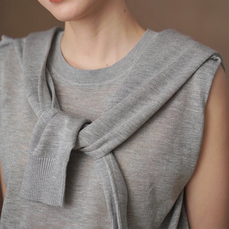 肩にニットを掛けたようなフェイクショール付きノースリーブニット。レーヨン混のやわらかな素材を使用し、自然なドレープ感が女性らしく、すっきり見えするシルエットが魅力です。シンプルながらも一枚でレイヤードスタイルが完成し、きれいめスカートにもパンツにも合わせやすく、オフィスカジュアルにもおすすめです。