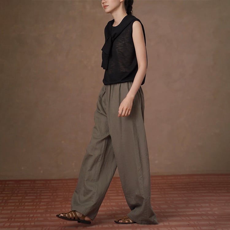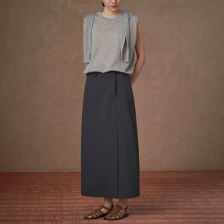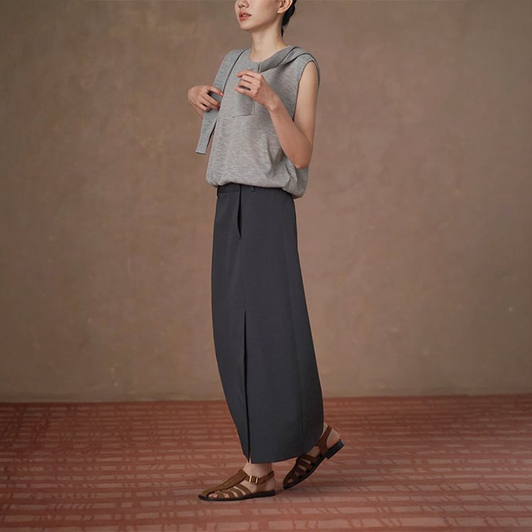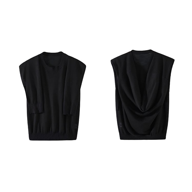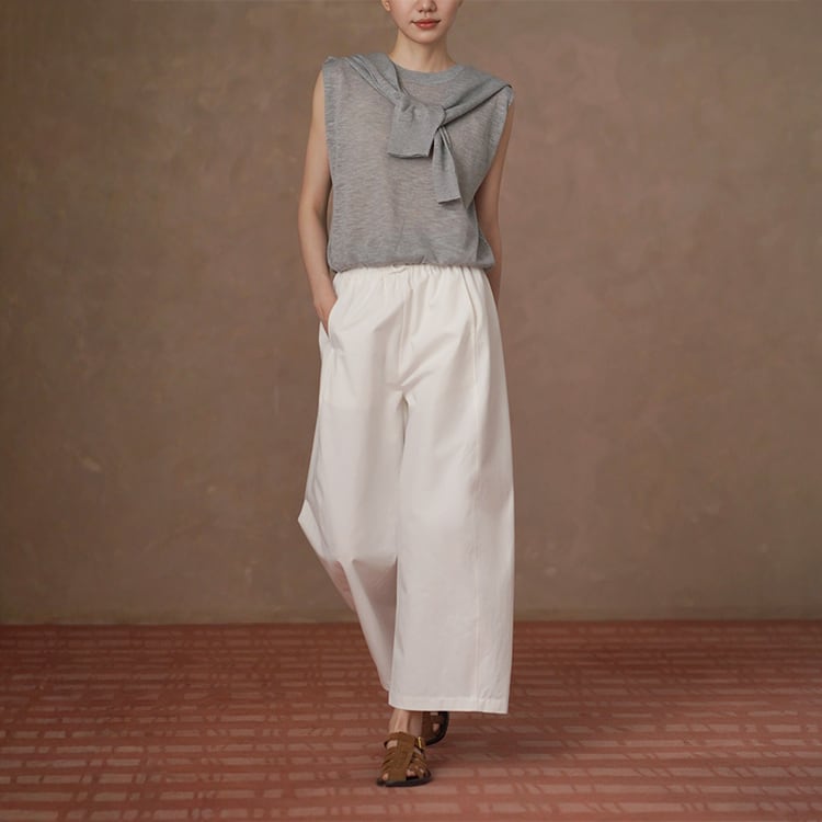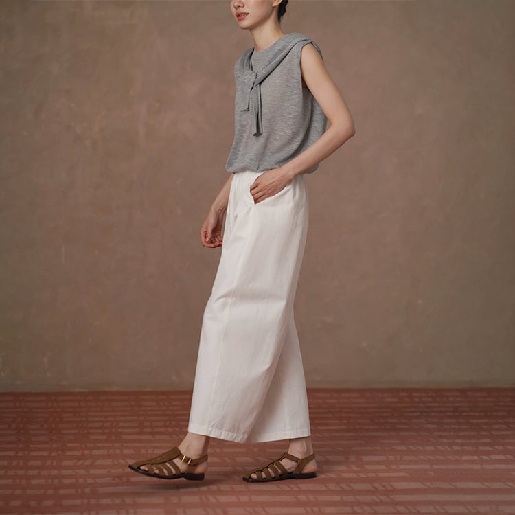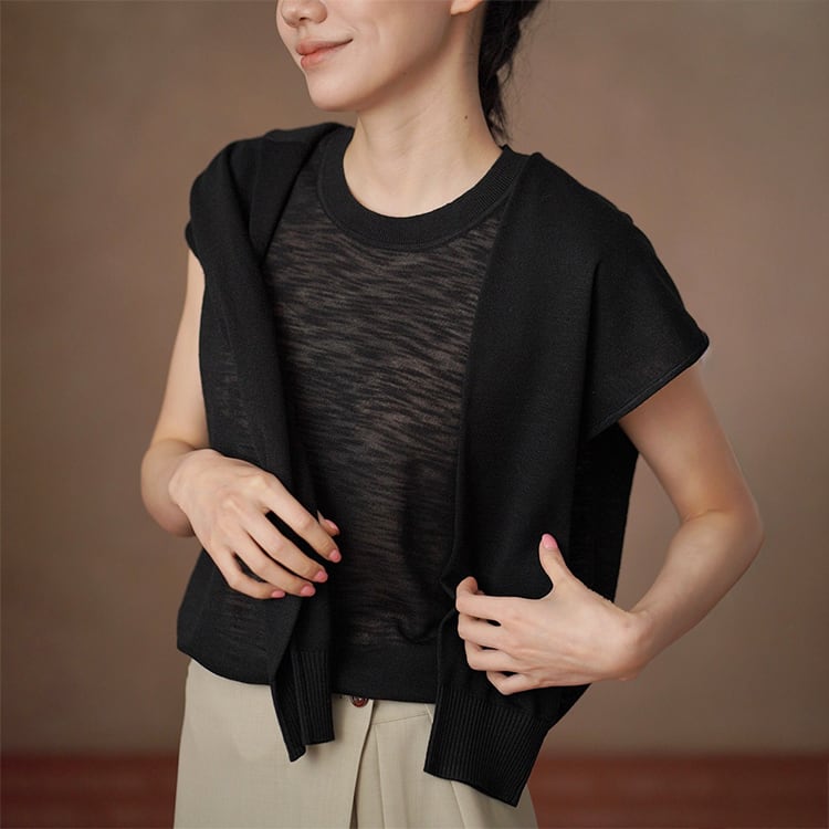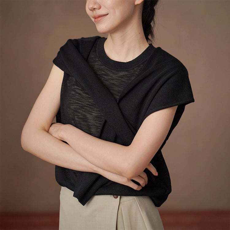 肩にニットを掛けたようなフェイクショール付きノースリーブニット。レーヨン混のやわらかな素材を使用し、自然なドレープ感が女性らしく、すっきり見えするシルエットが魅力です。シンプルながらも一枚でレイヤードスタイルが完成し、きれいめスカートにもパンツにも合わせやすく、オフィスカジュアルにもおすすめです。