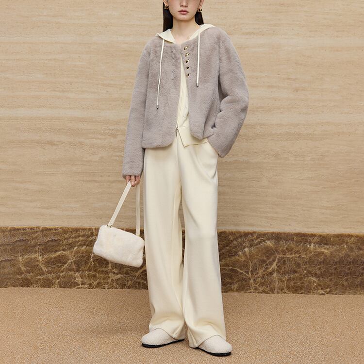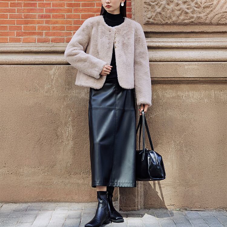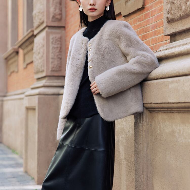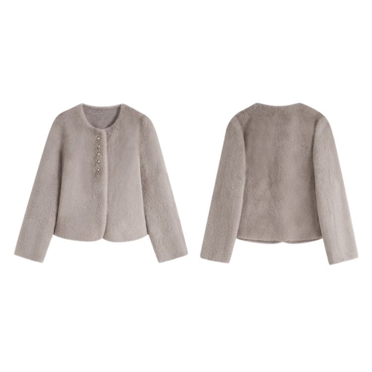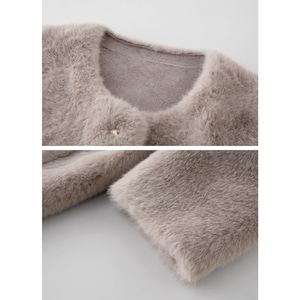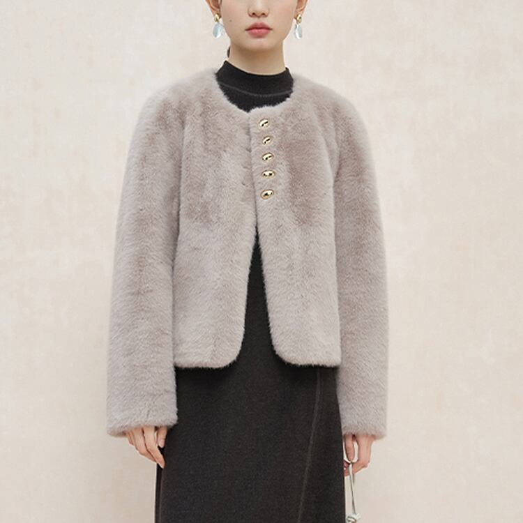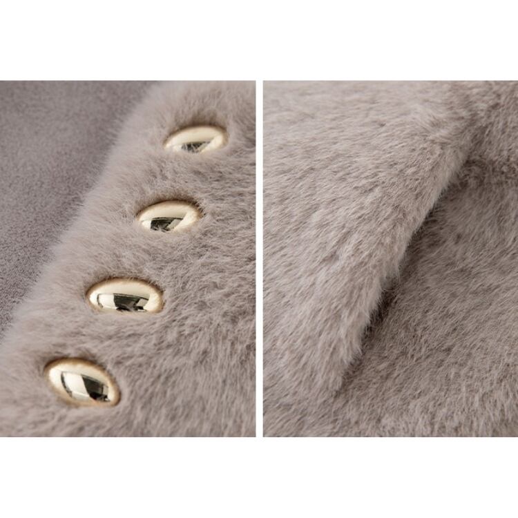 柔らかいカラーが魅力のフェイクファージャケット。ゴールドのデザインボタンが上品さをプラスし、エレガントな装いからカジュアルなコーディネートまで幅広く活躍します。秋冬のスタイルにぴったりな一着です。デイリー使いにも特別な日にもおすすめのアイテムです。